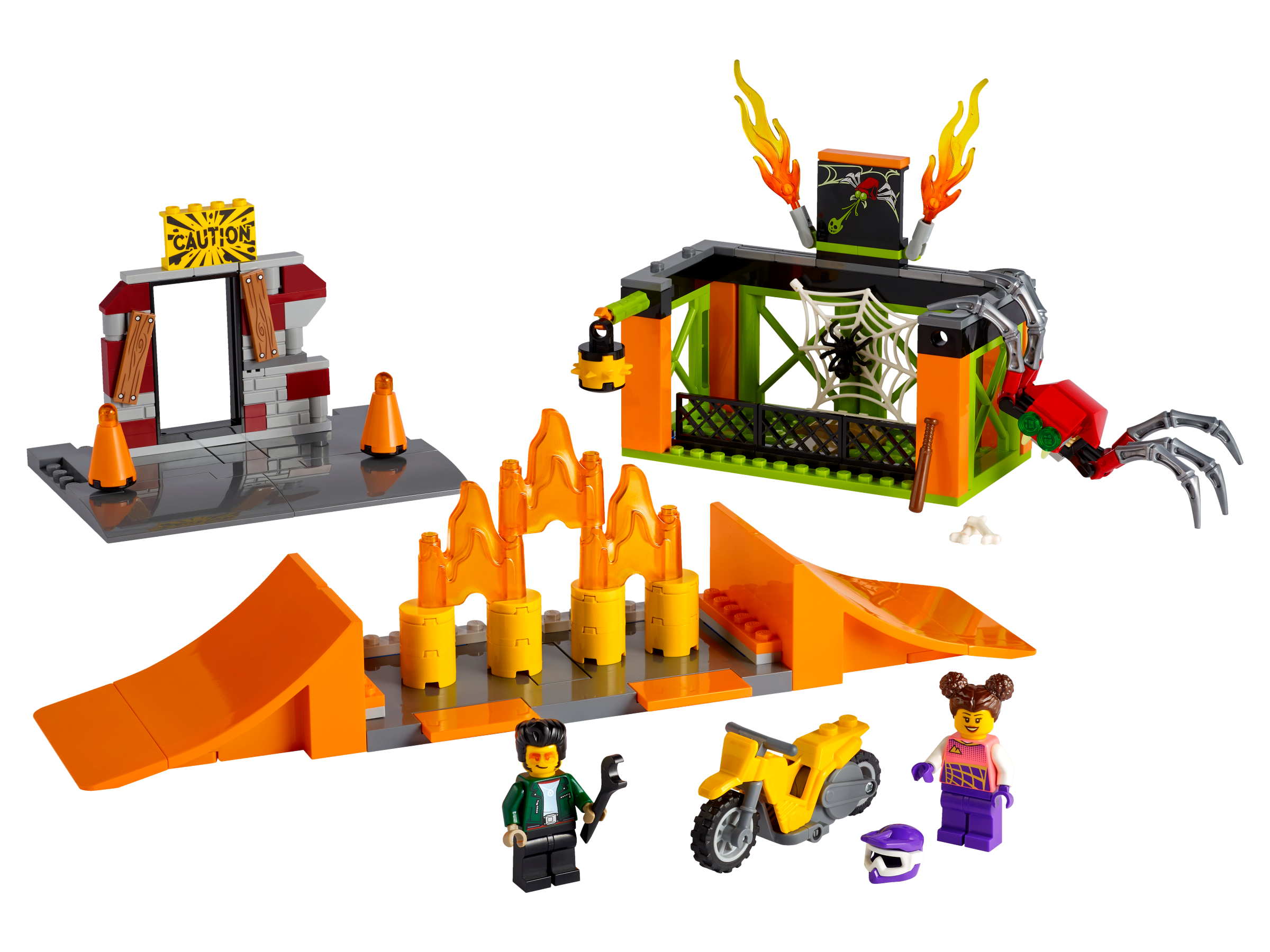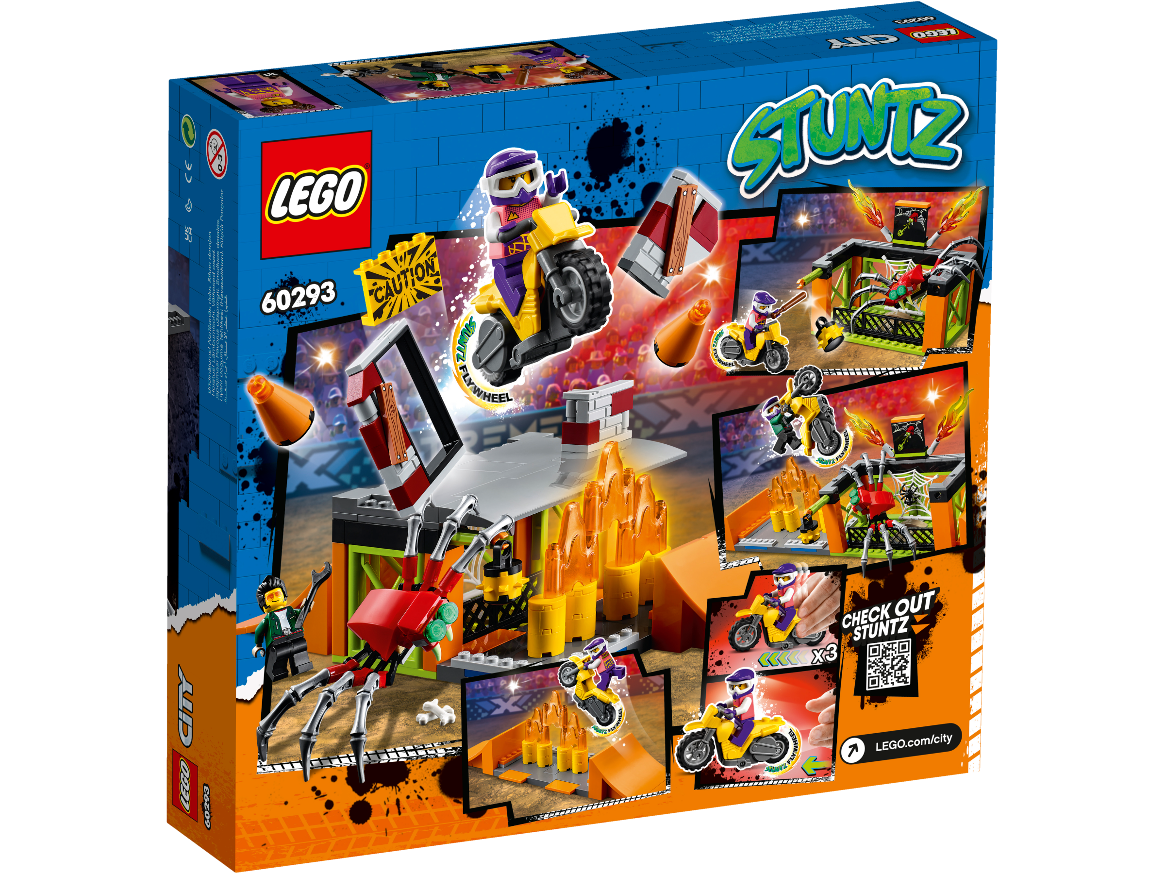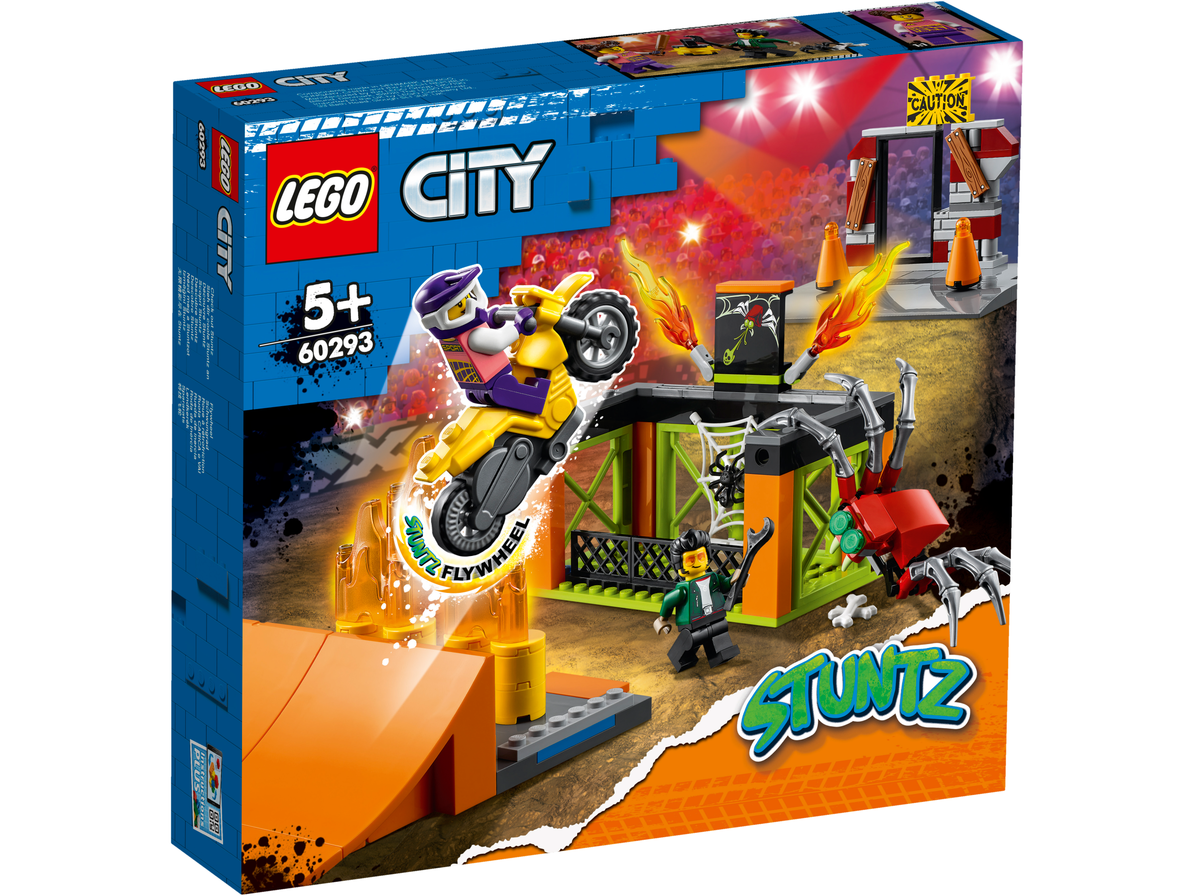 • Inhalt des Sets: Alles, was Kinder brauchen, um die Module des Stunt-Parks mit 2 Rampen, Hindernissen, Flammen und Spinnenkäfig sowie das Stuntbike mit Schwungrad zu bauen. Und natürlich die Minifigur Tread Octane aus der LEGO® City TV-Serie.