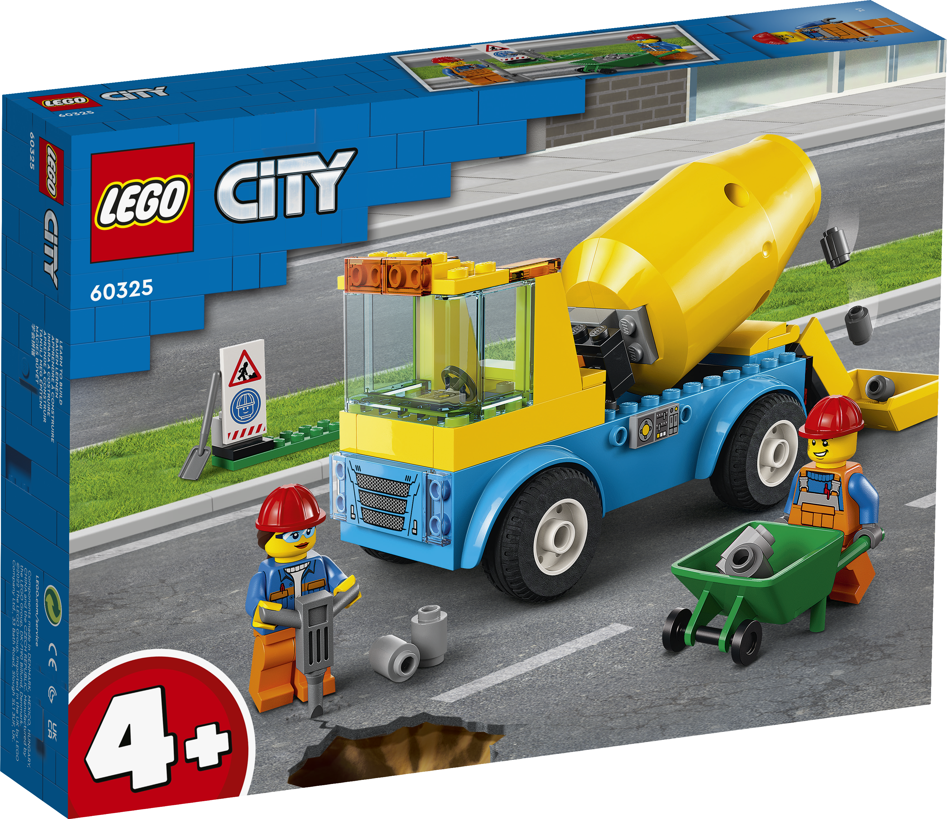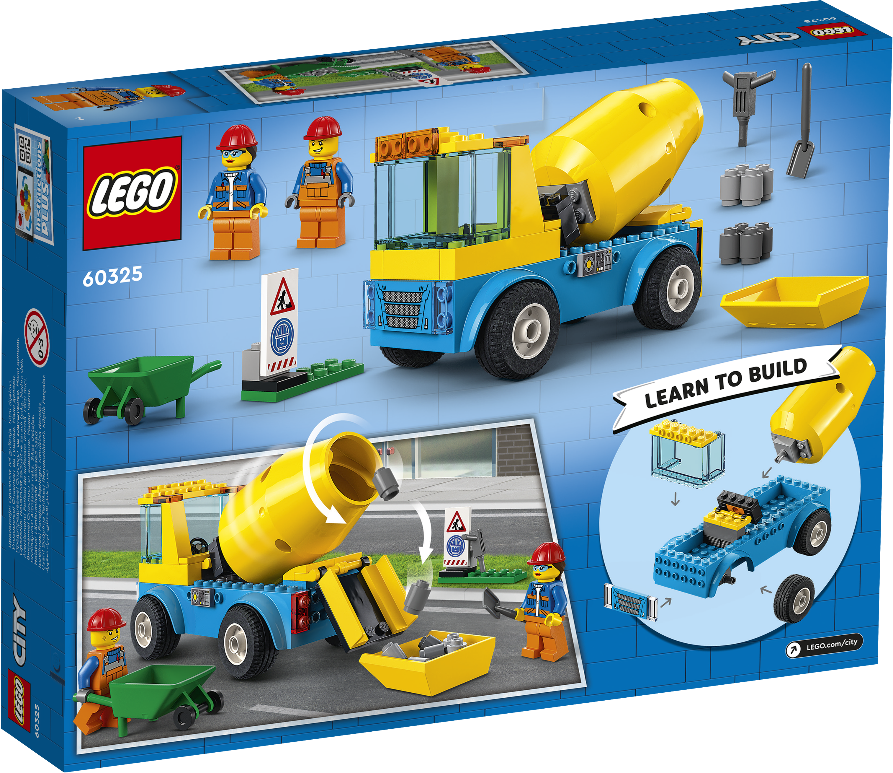 Mit dem LEGO® City Betonmischer (60325) können Kinder ihrer Fantasie freien Lauf lassen. Das Baufahrzeug verfügt über eine aufklappbare Fahrerkabine und eine drehbare Mischtrommel. Zum Set gehören auch ein Presslufthammer, eine Schubkarre und ein Verkehrsschild. All diese Spielzeuge und die beiden Bauarbeiter-Minifiguren lassen Kinder viele Stunden kreativ spielen. Für Jungen und Mädchen ab 4 Jahren Dieses 4+ Spielset verschafft Kindern mit dem Starter-Bauelement (einem vorgeformten Fahrgestell) einen tollen Einstieg. Eine gedruckte Schritt-für-Schritt-Bildanleitung liegt bei. In der kostenlosen LEGO Building Instructions App für Smartphones und Tablets ist außerdem eine interaktive Bauanleitung verfügbar. Die intuitiven Vergrößerungs- und Drehfunktionen lassen Kinder eine digitale Ansicht des fertigen Modells betrachten. Die Welt ganz spielerisch entdecken Fantastische Fahrzeuge und Maschinen sind für Kinder ein alltäglicher Anblick. Die LEGO City Bausets aus dem Universum der Starken Fahrzeuge lassen Kinder realistische Modelle näher betrachten. Außerdem laden witzige Figuren zu unzähligen fantasievollen Rollenspielen ein.
