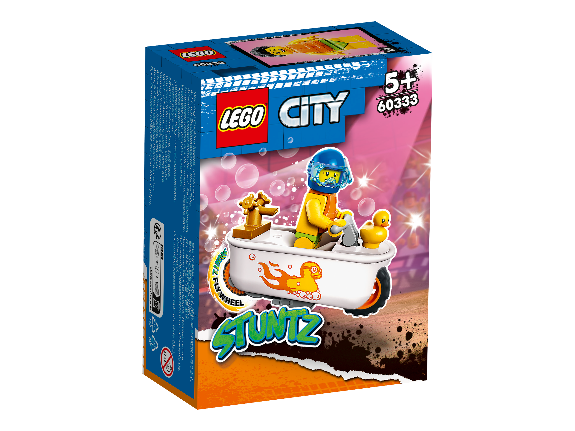 • Inhalt der Box: Dieses Spielset beinhaltet alles, was Kinder brauchen, um ein Stuntbike mit Schwungrad und eine LEGO® City Stuntz Minifigur, den Badewannenrennfahrer Sudsy Simon, mit Badeente, Schnorchel, Taucherbrille und Schwimmweste zu bauen