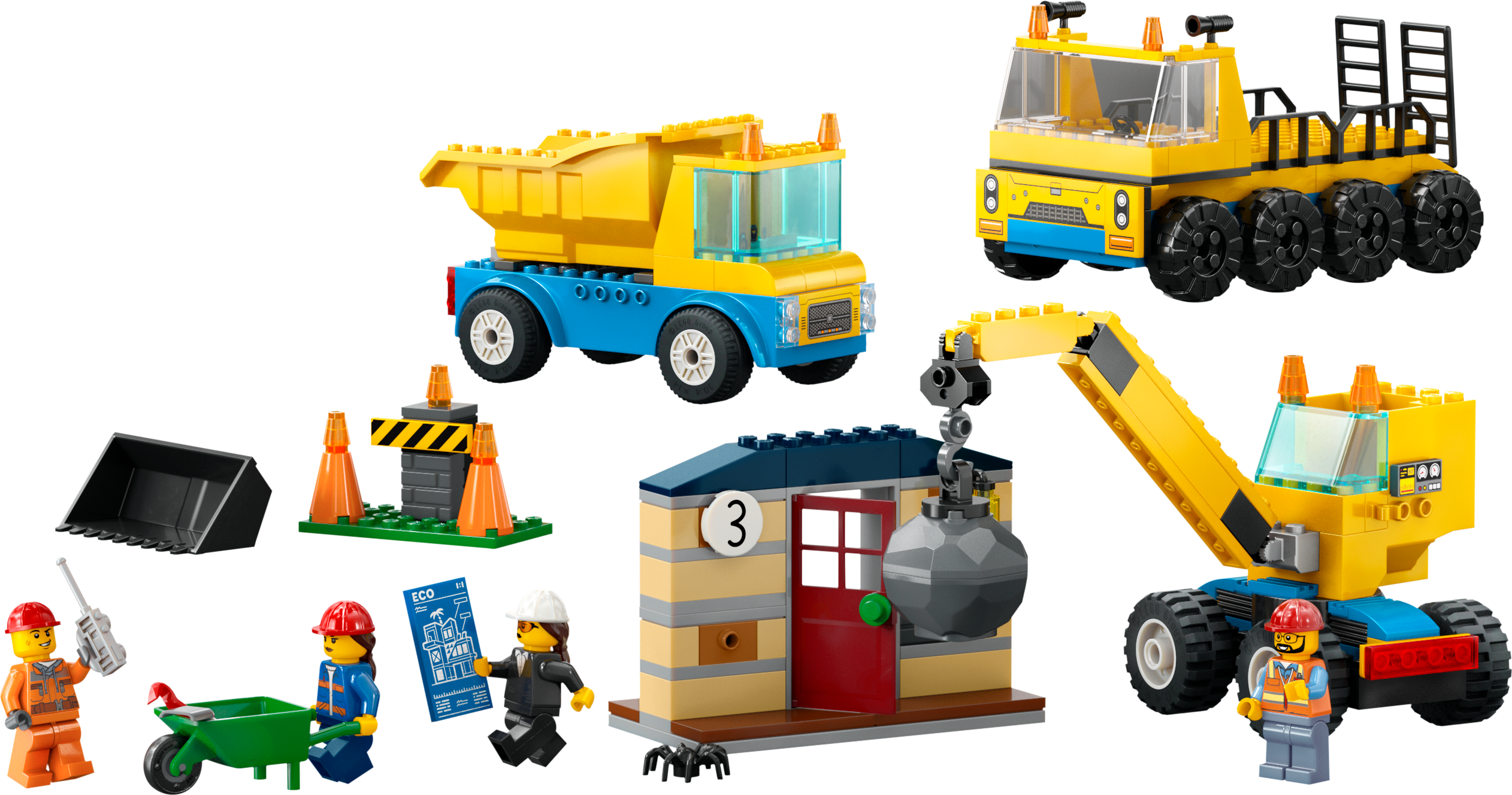 Inhalt der Box: Alles, was Kinder brauchen, um einen Transporter, einen Kran mit Abrissbirne, einen Kipplaster und ein baufälliges Haus zu bauen, sowie 3 Bauarbeiter-Minifiguren und cooles Zubehör für fantasievolle Rollenspiele
