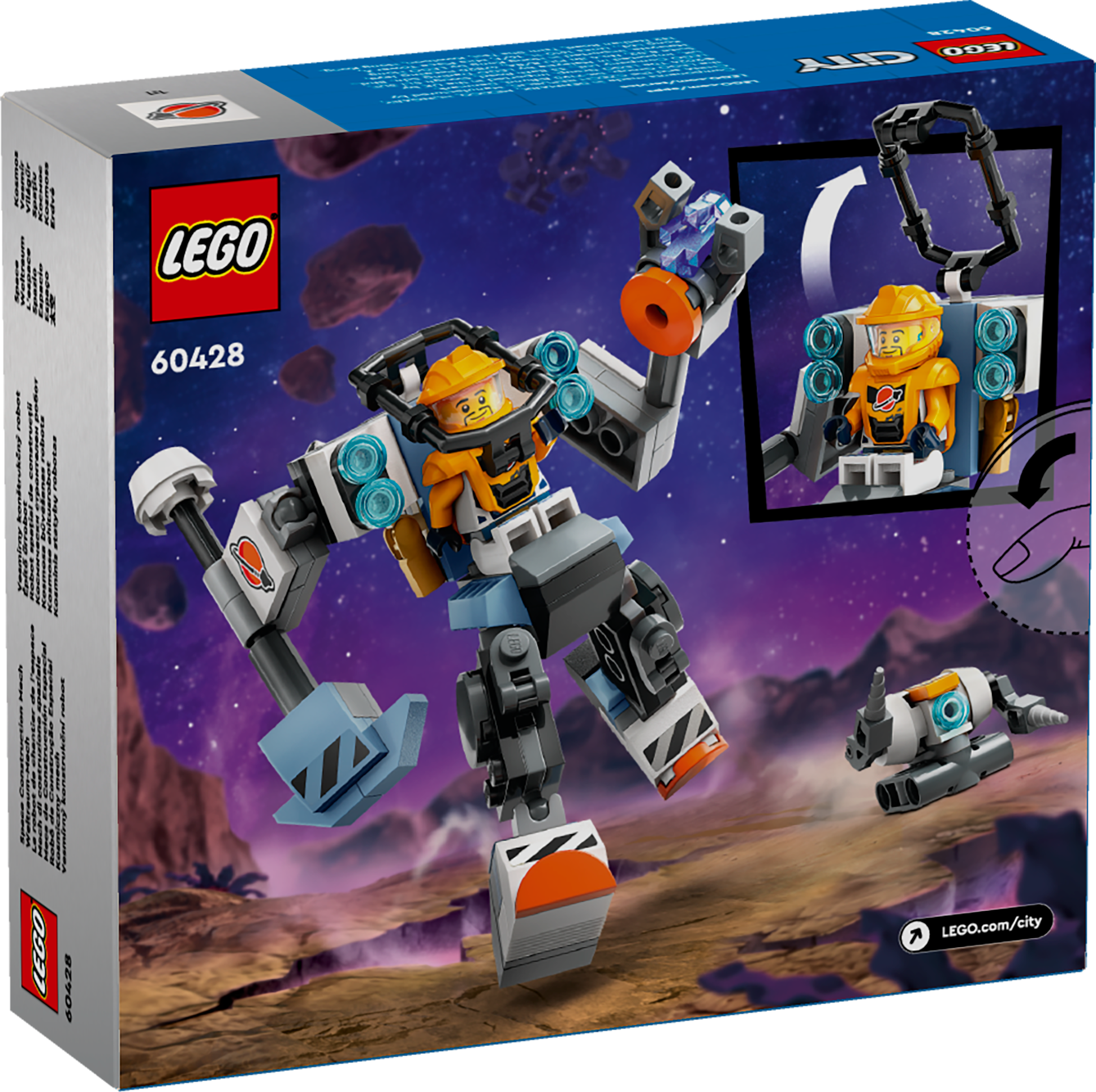 Inhalt dieses LEGO® Bausets: Alles, was Kinder brauchen, um einen beweglichen Mech, einen Weltraum-Bauroboter, eine Weltraumcrew-Minifigur und eine Planetenkulisse mit Gestein und Kristallen zu bauen
