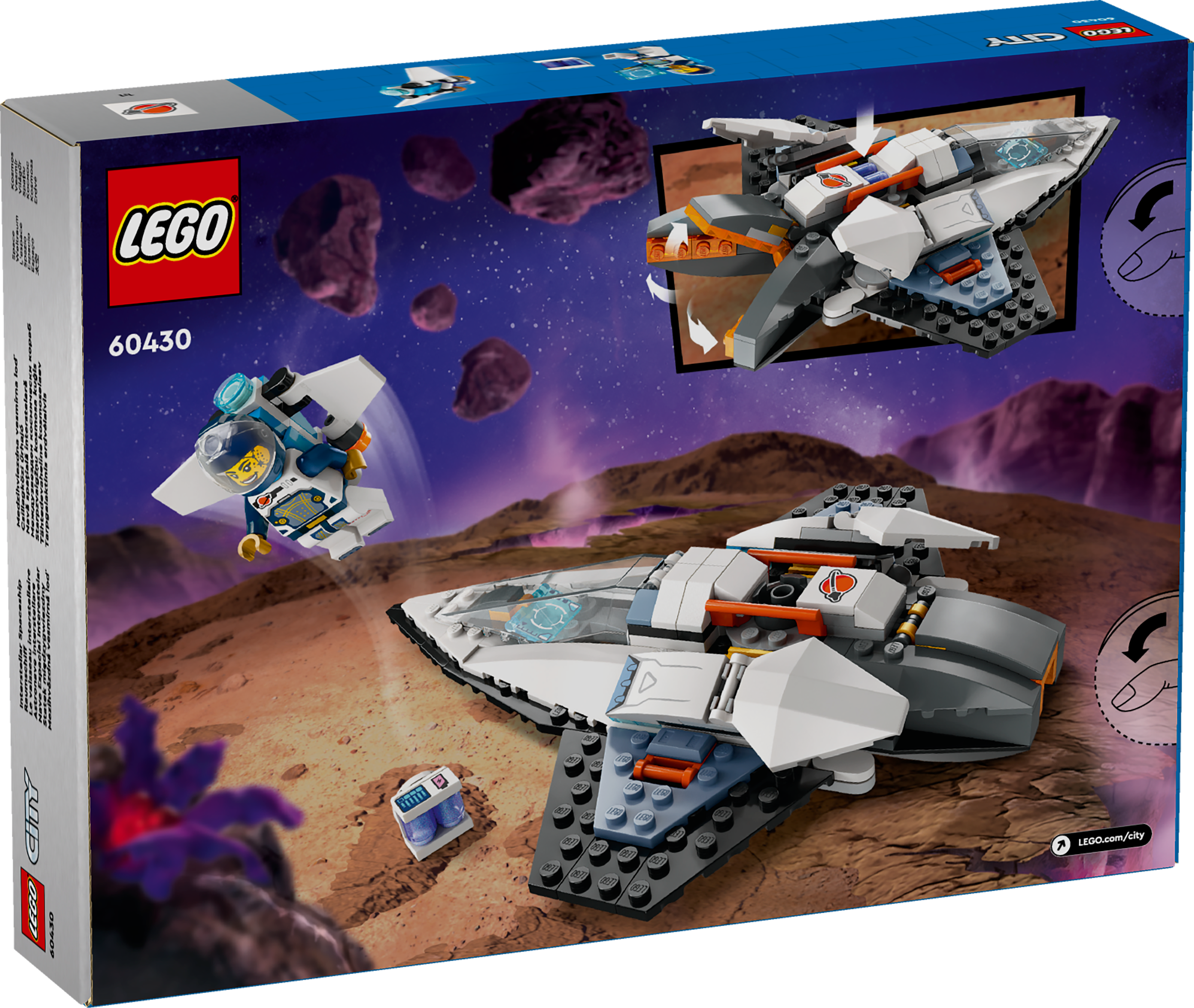 Weltraumforscher ab 6 Jahren können sich auf spannende Actionabenteuer mit diesem futuristischen LEGO® City Raumschiff (60430) freuen. Das Spielset beinhaltet ein superschnelles Raumschiff für einen Astronauten. Dein Kind kann einen Spielzeug-Akkusatz in das Modell stecken, um die Hauptschubdüsen auszuklappen und mit Lichtgeschwindigkeit zu den entlegensten Winkeln der Galaxie zu fliegen. Das Set beinhaltet auch einen Drohnenroboter, den man in einen Raketenrucksack für die beiliegende Weltraumcrew-Minifigur verwandeln kann. Begleite deinen jungen Weltraumfan auf ein faszinierendes Abenteuer! Lade dir die LEGO Builder App herunter und freu dich auf ein völlig neues Bauerlebnis. Die enthaltenen Funktionen lassen dein Kind 3D-Ansichten der Modelle vergrößern und drehen, Spielsets speichern und seinen Baufortschritt verfolgen. LEGO City Weltraum-Spielsets sind tolle Geschenke zu jedem Anlass und beinhalten wirklichkeitsgetreue Fahrzeuge, detailreiche Bauwerke und faszinierende Figuren, die Fantasie und Wirklichkeit zu einem fantasievollen Spielerlebnis ohne Limits verschmelzen lassen. Für weitere spannende Abenteuer kann dein Kind dieses Bauset mit anderen separat erhältlichen LEGO City Weltraum-Sets kombinieren.