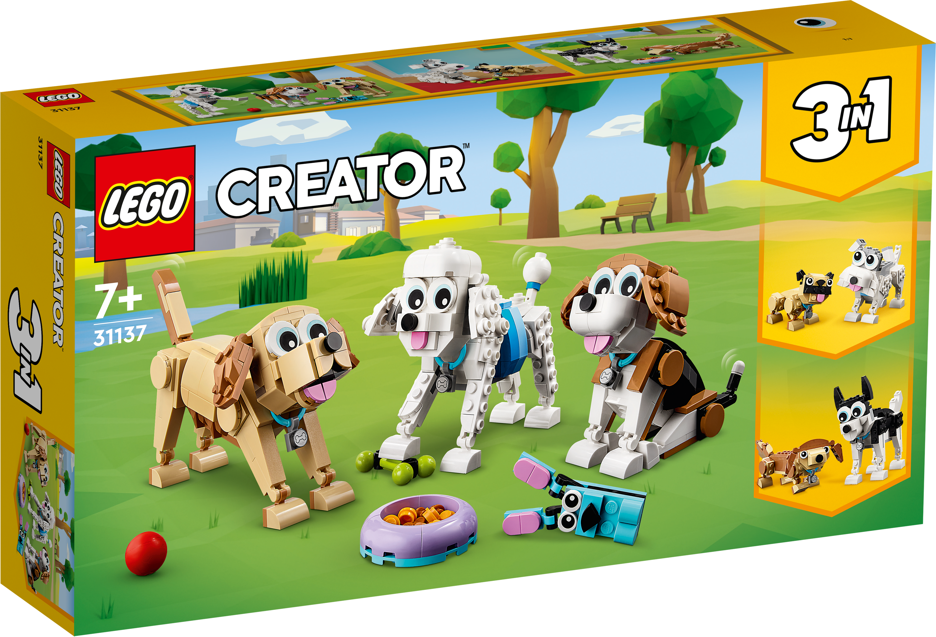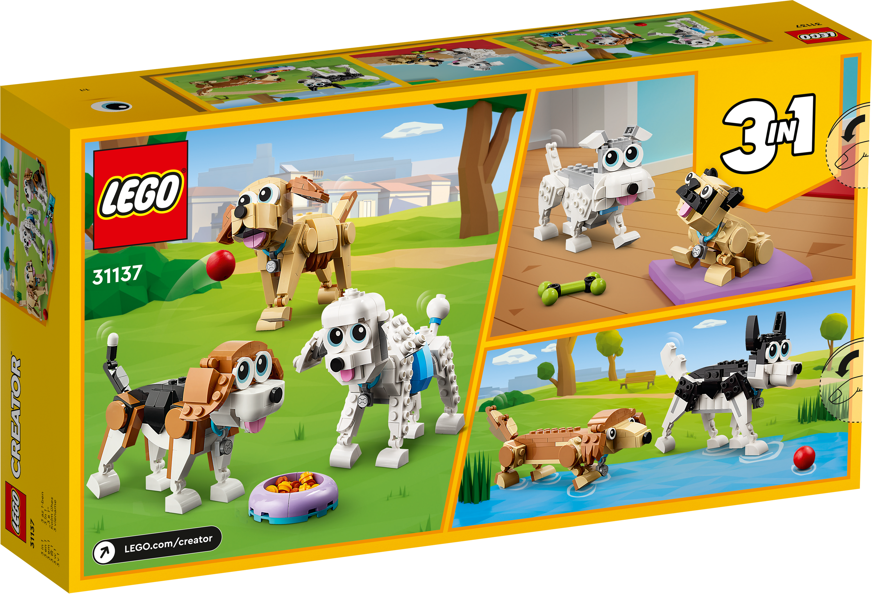 3-in-1-Bauset: LEGO® Creator Niedliche Hunde (31137) ist ein 3-in-1-Spielset, das dein Kind 3 verschiedene Gruppen von Vierbeinern erschaffen lässt