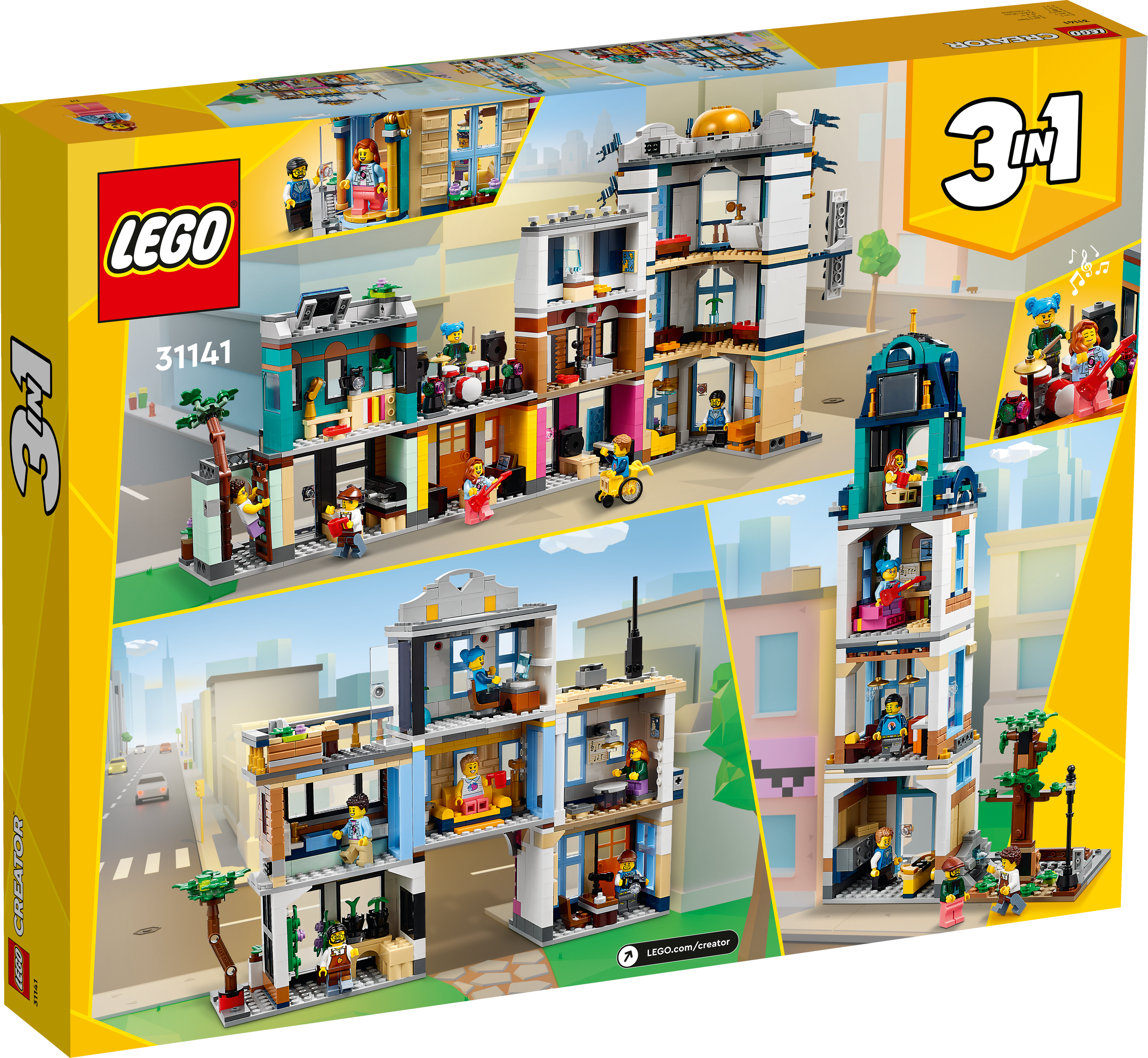LEGO® Creator Hauptstraße (31141); Bau- und Spielset; umfasst eine Spielzeugstadt, ein Art-déco-Gebäude, eine Einkaufsstraße, ein Hotel, ein Café, einen Musikladen und 6 Minifiguren; bietet Kindern ab 9 Jahren unzählige Spielmöglichkeiten (1.459 Teile)