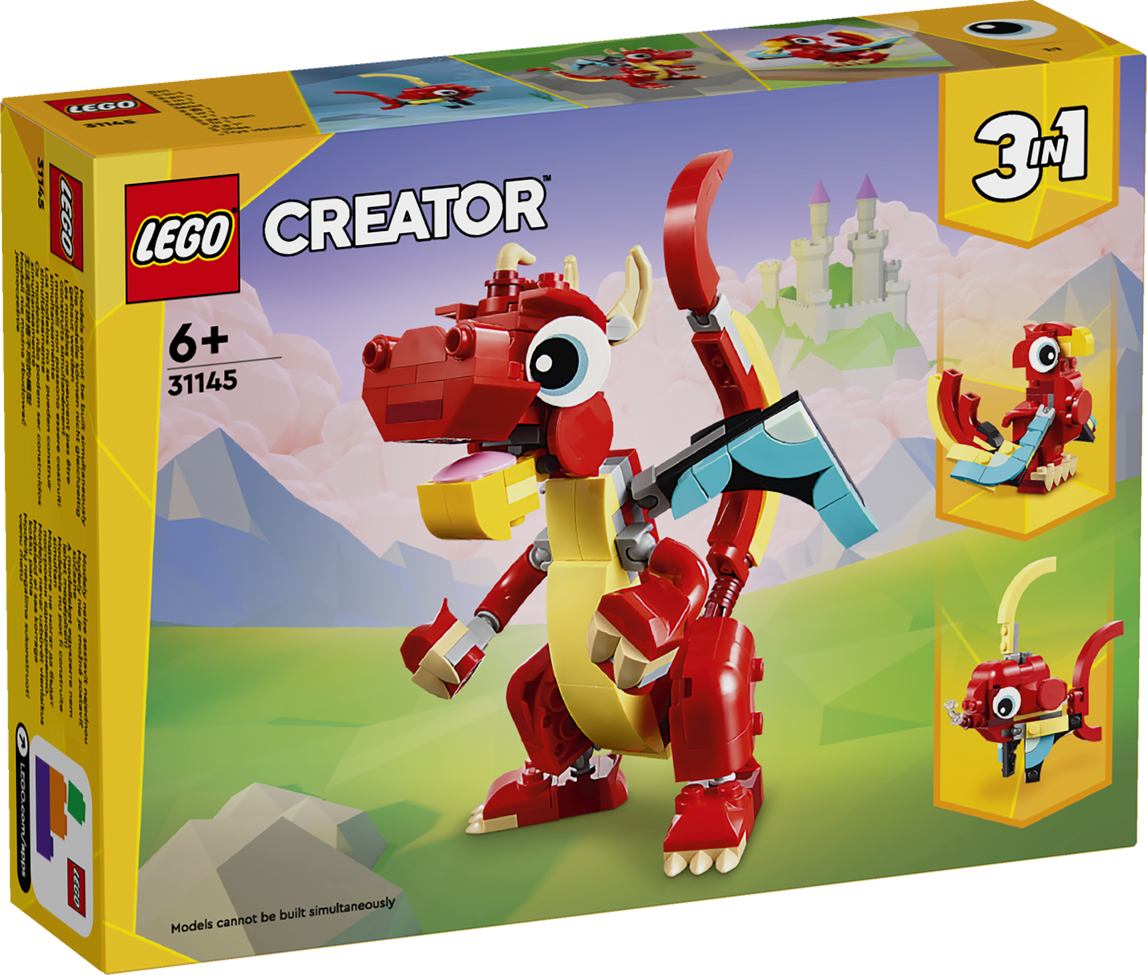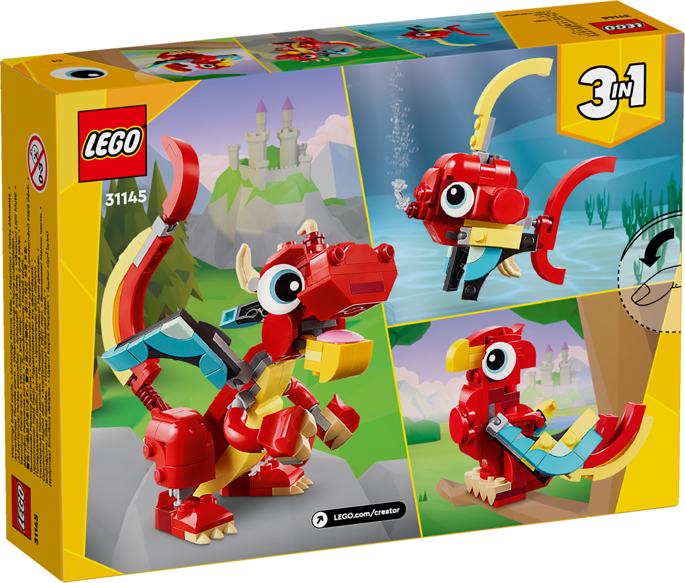 Roter Drache (31145) ist ein 3-in-1-Bauset, das kreative Kinder ab 6 Jahren in ein magisches Land reisen und spannende Geschichten darstellen lässt. Der freundliche Spielzeugdrache hat große Augen und kann Arme, Hände, Flügel, Beine, Kopf und Maul bewegen, damit er bei jedem Abenteuer in die richtige Pose gebracht und anschließend eindrucksvoll ausgestellt werden kann. Dieses LEGO® Creator Set bietet deinem Kind unzählige Spielmöglichkeiten mit 3 verschiedenen Spielzeugtieren, die man mit den Steinen aus ein und derselben Box bauen kann. Dein Kind kann einen beweglichen Spielzeugdrachen bauen und dann in einen Phönix mit buntem Gefieder, in einen Fisch mit beweglichen Flossen oder in ein eigenes LEGO Tier verwandeln. LEGO Creator 3-in-1-Spielzeuge sind tolle Geschenke für Kinder, denn mit den Steinen in jeder Box kann dein Kind 3 verschiedene Modelle bauen und immer wieder umgestalten. 3-in-1-Sets bieten Kindern mit unterschiedlichsten Interessen stundenlanges Spielvergnügen mit einer breiten Auswahl an Modellen. Hierzu zählen rasante Fahrzeuge, faszinierende Tiere und detailreiche Stadtkulissen.