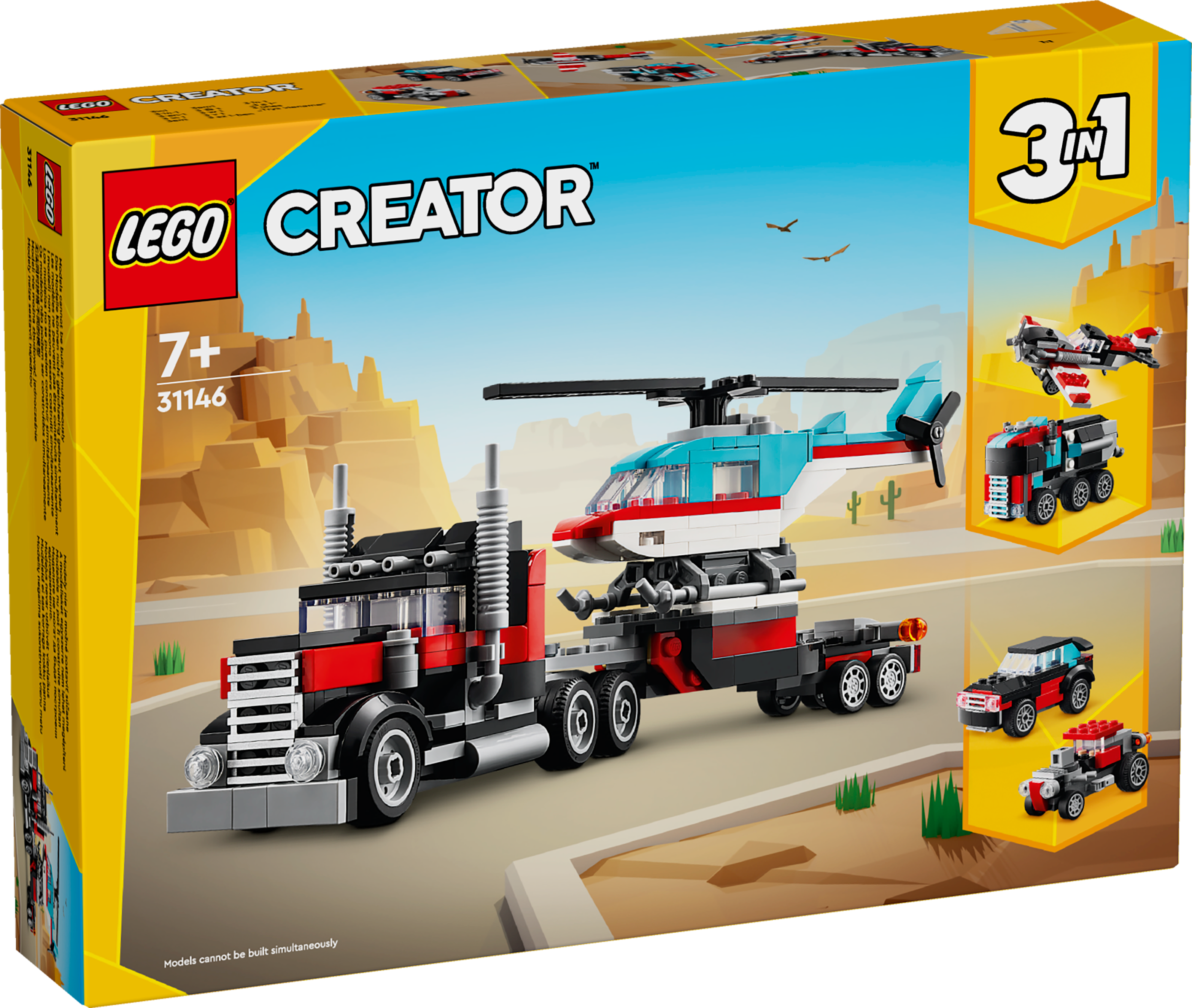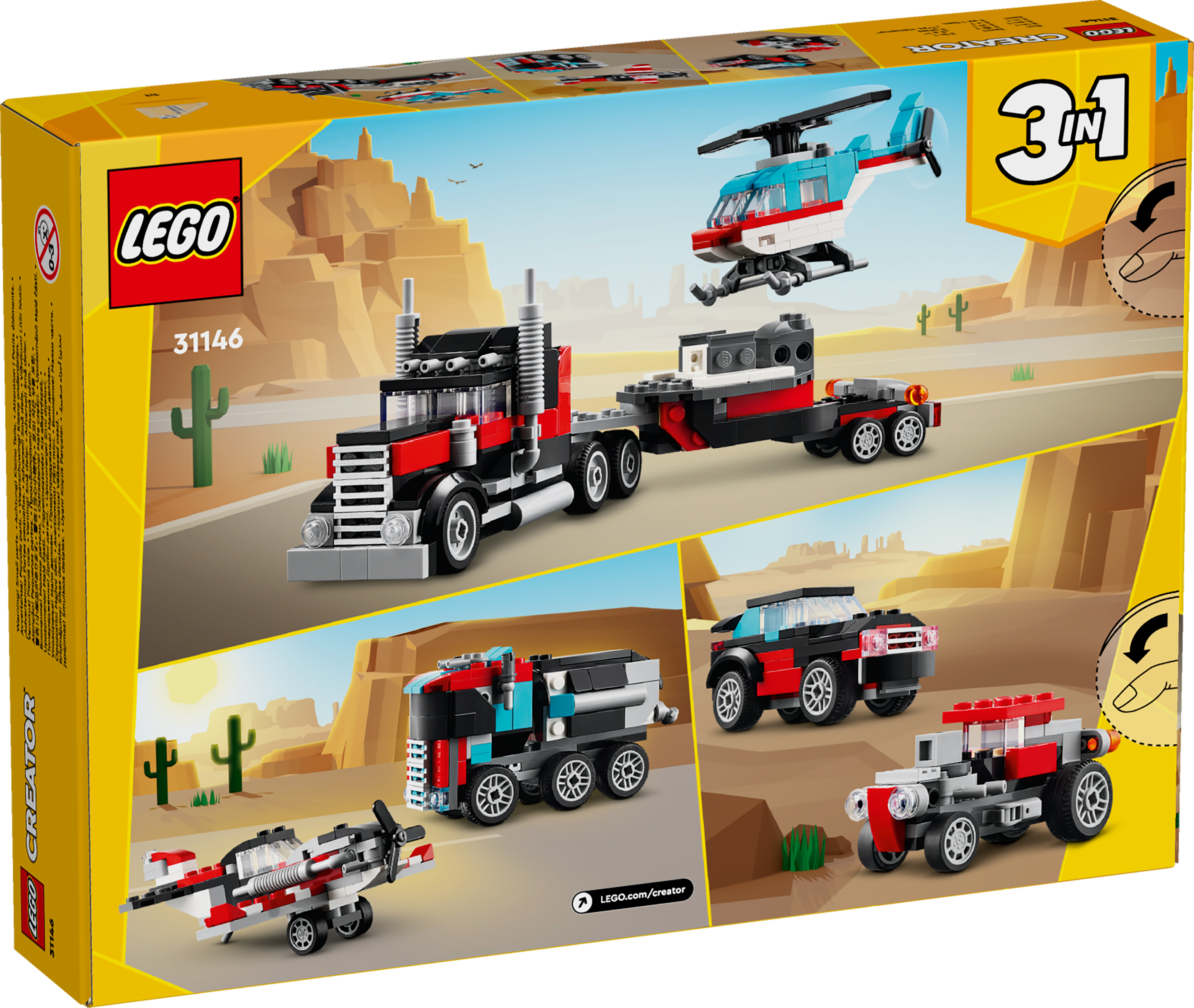 LEGO® Creator Tieflader mit Hubschrauber (31146) lässt Jungen und Mädchen ab 7 Jahren rasante Abenteuer darstellen. Kinder können die 270 Teile aus diesem 3-in-1-Spielset zu einem coolen Sattelzug zusammenfügen, der den LEGO Hubschrauber auf seinem Auflieger transportiert. Mit diesem LEGO Creator 3-in-1-Spielzeug kann dein Kind 3 x 2 verschiedene Fahrzeuge bauen. Den Tieflader mit drehenden Rädern und den Hubschrauber mit kreisenden Motoren kann man entweder in ein Propellerflugzeug mit Tanklaster oder für packende Rennen in einen Hot Rod und ein SUV umbauen. Aber natürlich lassen sich die Teile aus diesem Set auch zu eigenen fantasievollen Fahrzeugen zusammenstecken. LEGO Creator 3-in-1-Spielzeuge sind tolle Geschenke für Kinder, denn mit den Steinen in jeder Box kann dein Kind 3 verschiedene Modelle bauen und mit großer Begeisterung immer wieder umgestalten. 3-in-1-Sets bieten Kindern mit unterschiedlichsten Interessen stundenlanges Spielvergnügen mit einer breiten Auswahl an Modellen. Hierzu zählen rasante Fahrzeuge, faszinierende Tiere und detailreiche Stadtkulissen.