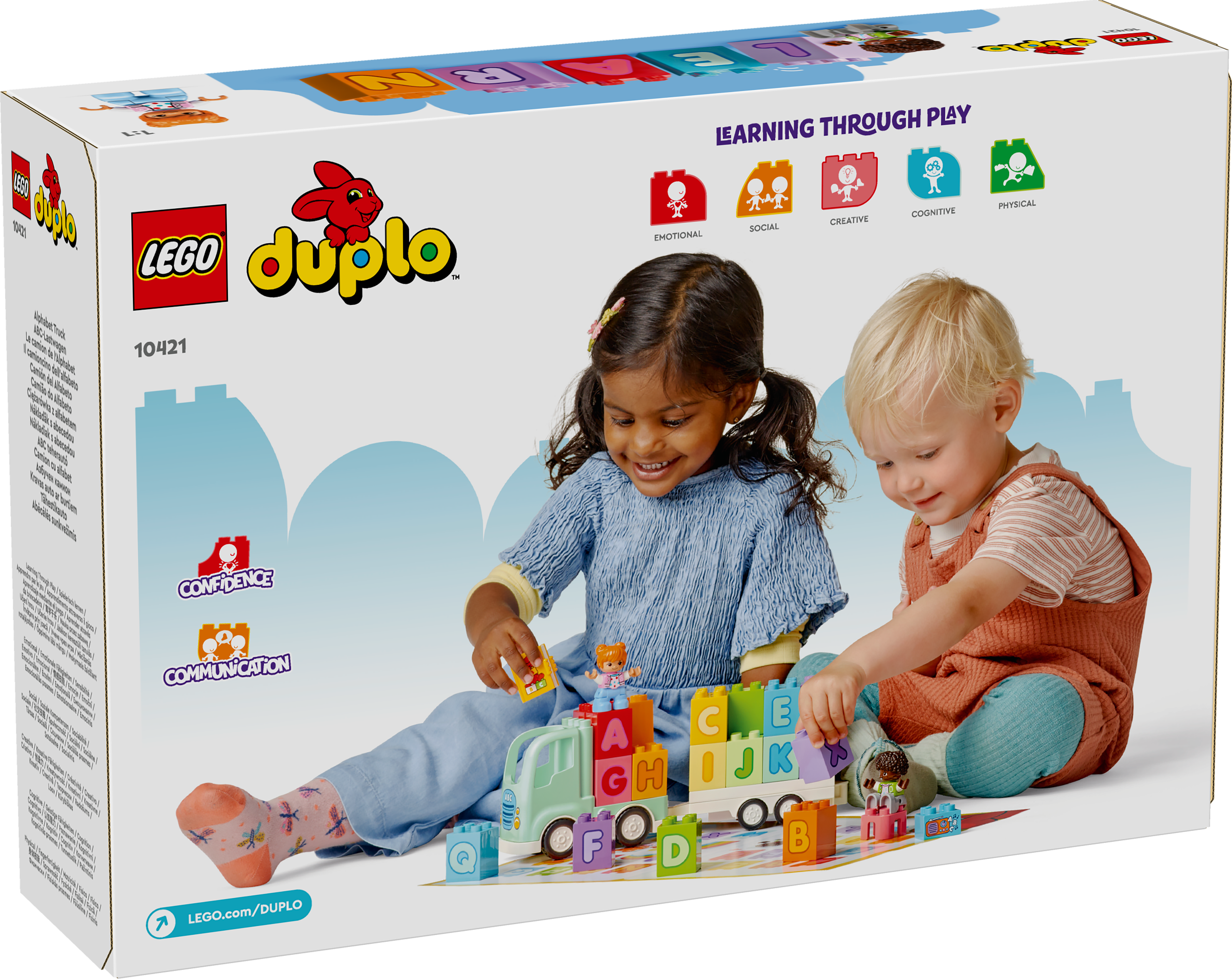 Der LEGO® DUPLO® Town ABC-Lastwagen (10421) ist ein tolles Bauspielzeug, das Vorschulkindern hilft, die Buchstaben zu lernen. Dieses kreative ABC-Spielzeug lässt Vorschulkinder ganz spielerisch lernen. Wenn Kleinkinder den Anhänger an den Spielzeug-LKW ankoppeln und den beiden LEGO DUPLO Figuren helfen, die Steine auf- und abzuladen, erkennen sie erste Buchstaben, lernen die Farben, verbessern ihre Sprechfähigkeit und entwickeln Fingerfertigkeit. Das fantasievolle Zubehör beinhaltet auch ein LEGO DUPLO ABC-Buch und eine Stereoanlage, die Eltern und Kleinkinder dazu anregen sollen, miteinander die Buchstaben zu singen. Dieses entwicklungsfördernde Spielzeug ermutigt Vorschulkinder, sich kreative eigene Geschichten auszudenken, in den Spielzeug-LKW zu steigen und zum nächsten Abenteuer loszubrausen! Lass Kleinkinder mit LEGO DUPLO Bauspielzeugen tolle erste Entwicklungsschritte machen, ganz frei und kreativ spielen, sich selbst darstellen und ganz viel lernen.