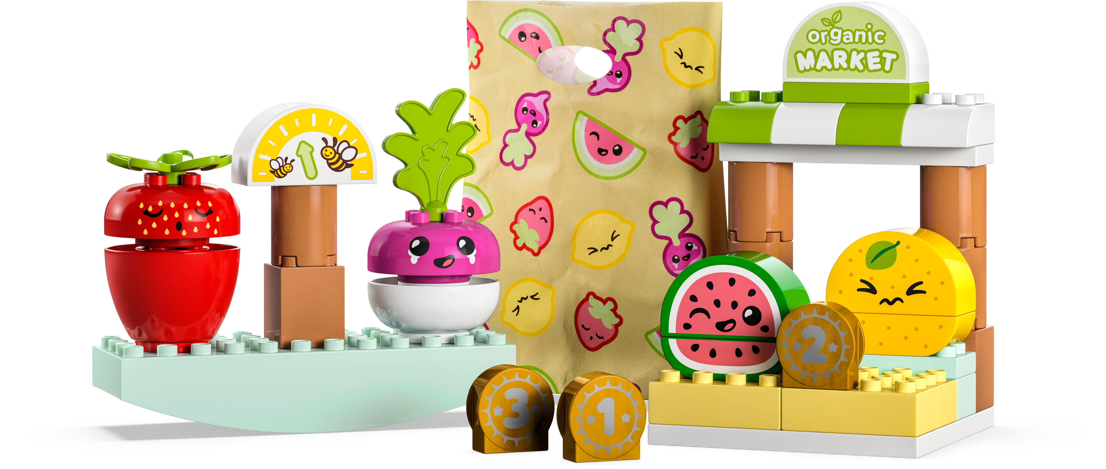 Spielzeug-Bauernmarkt für Kleinkinder: Der LEGO® DUPLO® Biomarkt (10983) lässt kleine Baumeisterinnen und Baumeister ab 18 Monaten zum ersten Mal „Kaufmannsladen“ spielen