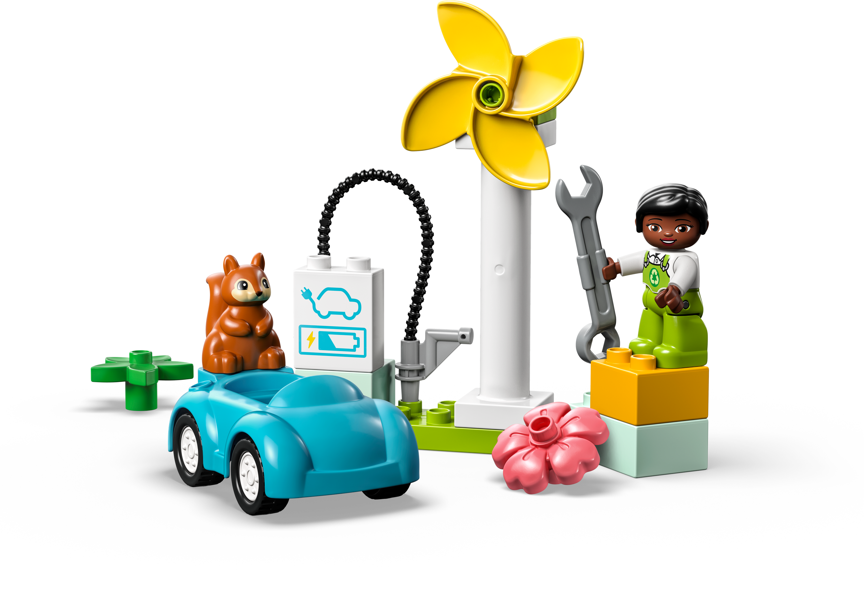 LEGO® DUPLO® Town – Windrad und Elektroauto (10985) ist ein tolles Set, das Kleinkinder kreativ spielen lässt. Eine Ladestation, ein Elektroauto, ein Schraubenschlüssel, eine Technikerin und ein Eichhörnchen laden Vorschulkinder ab 2 Jahren dazu ein, den Alltag in Form von spannenden Rollenspielen nachzustellen und ganz spielerisch etwas über eine nachhaltige Lebensweise zu erfahren. Kreatives Spielerlebnis für neugierige Kinder Unzählige Aktivitäten laden Kleinkinder ab 2 Jahren immer wieder zum Spielen ein. Dein Kind kann das Windrad drehen, um Strom zu erzeugen, und das Auto an die Ladestation anschließen. Gern wird dein Kind die Technikerin das Auto oder das Windrad reparieren lassen. Und das niedliche Eichhörnchen kann den Schraubenschlüssel anreichen. Faszinierende Spielzeuge, die reichlich Gesprächsstoff liefern LEGO DUPLO Spielzeuge lassen Kleinkinder fantasievoll spielen und auf diese Weise ihre Umwelt erkunden. Und Eltern können zusammen mit ihrem Nachwuchs auf eine spannende Entdeckungsreise gehen.
