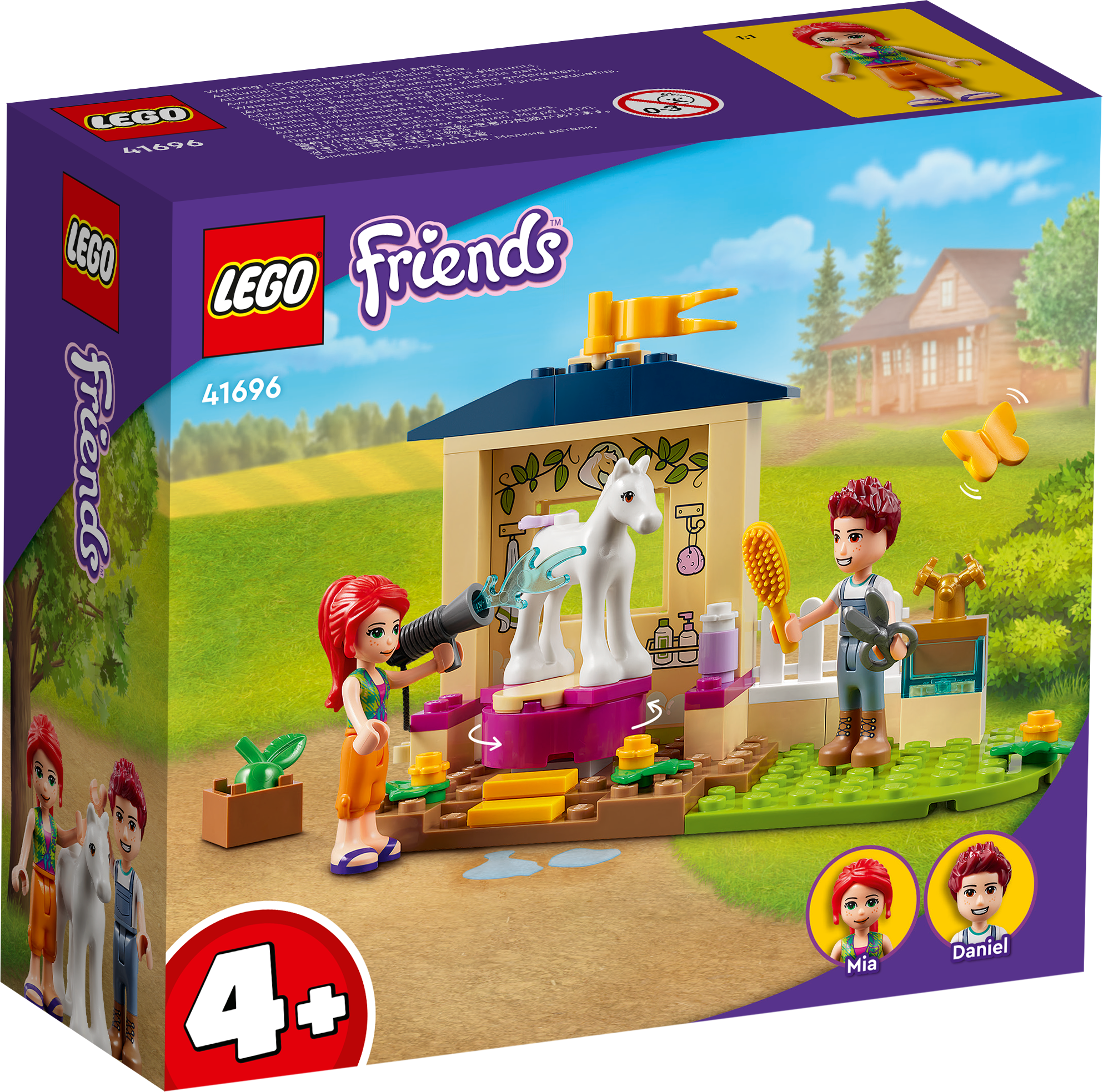 Jede Menge spannende Funktionen: Das Set beinhaltet die LEGO® Friends Spielfiguren Mia und Daniel, ein Spielzeugpony, eine Drehscheibe zum Abduschen des Pferds, einen Schmetterling, einen Apfel, Bürsten und Klammern sowie eine Tränke