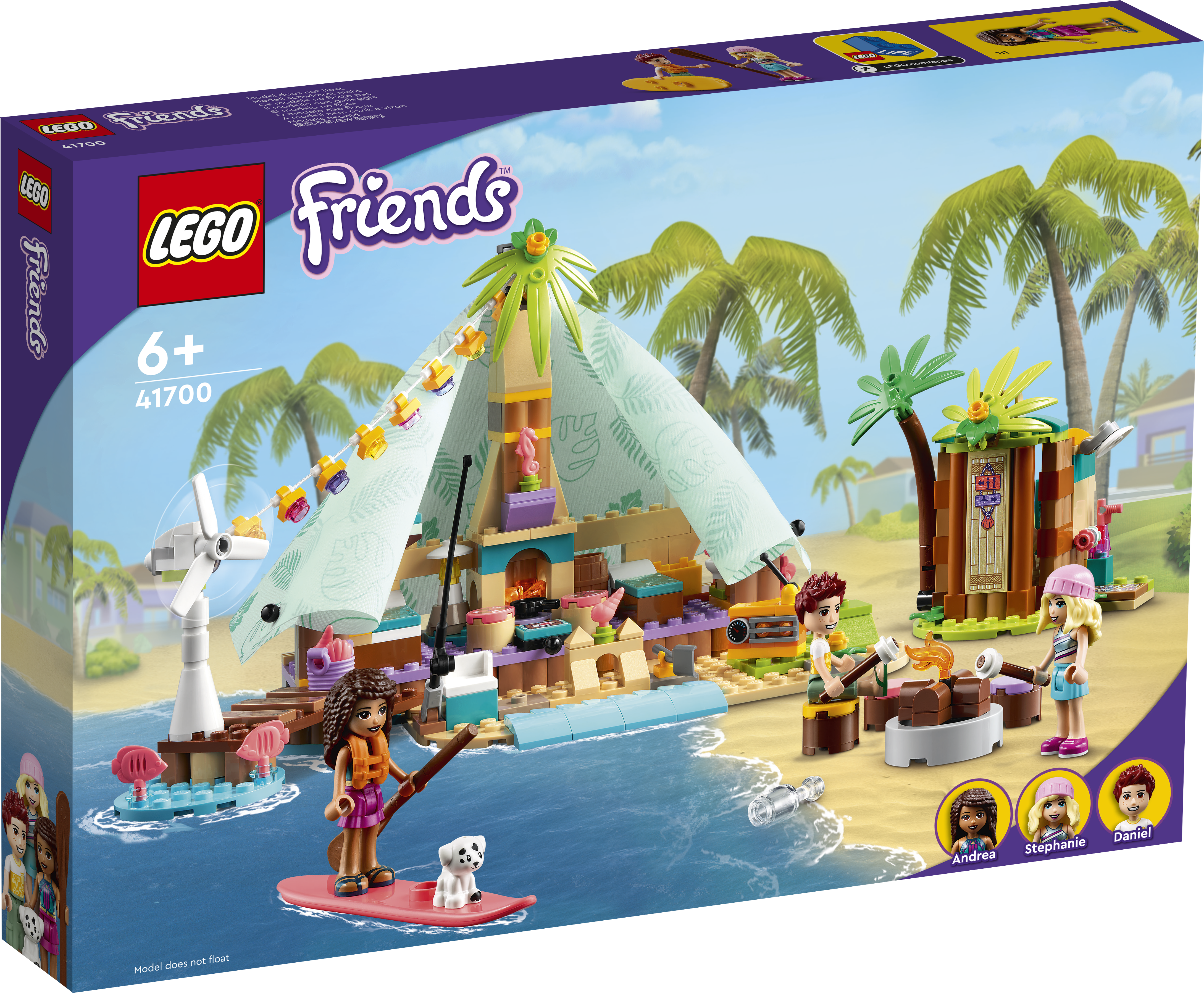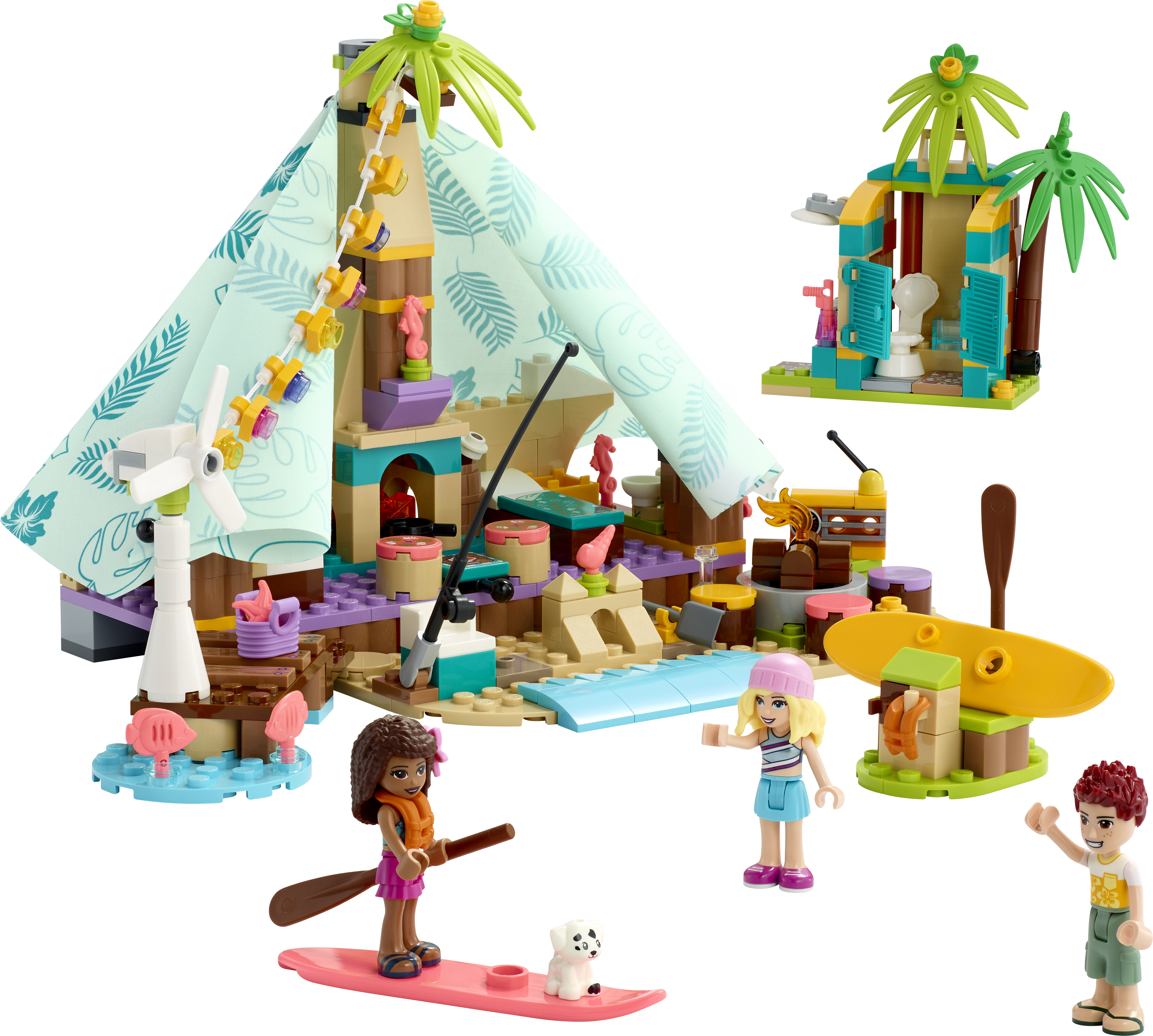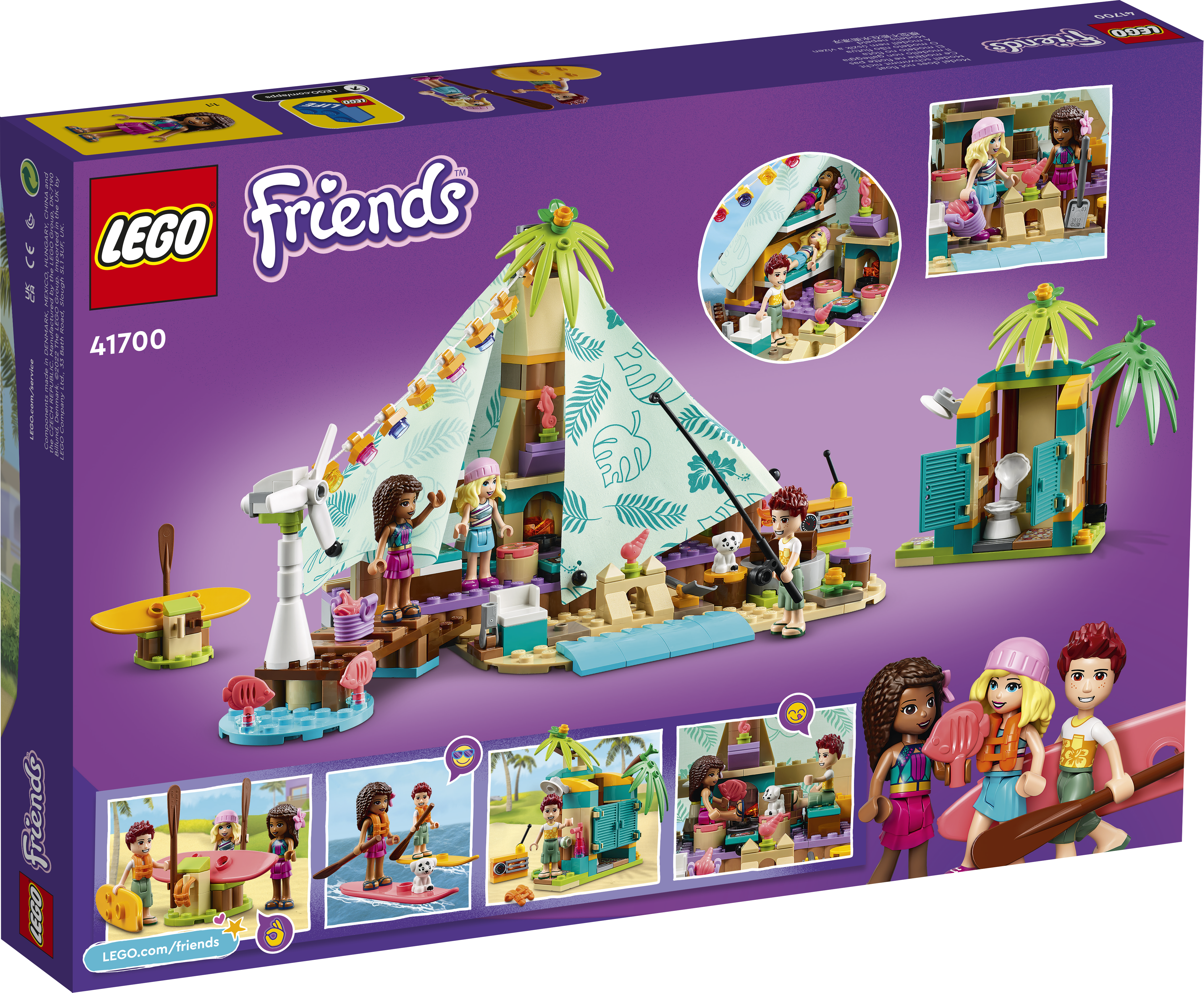 • Stilvolles Camping: Das LEGO® Friends Spielset „Glamping am Strand“ beinhaltet 3 Spielfiguren, einen Welpen, ein Stoffzelt mit Stockbetten, einen Campingkocher sowie ein kreisendes Windrad, das die Lichter mit Strom versorgt
