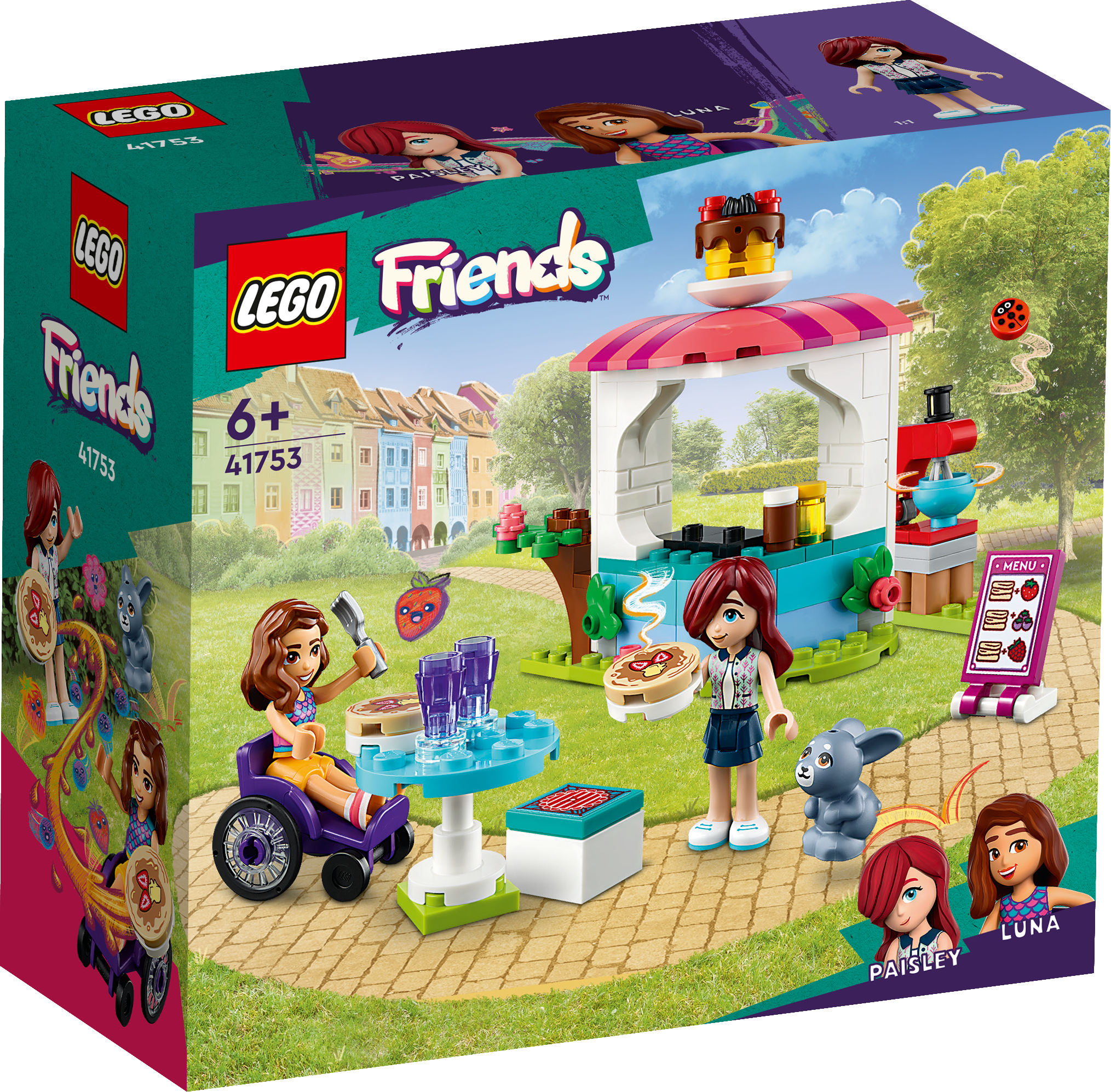 Der LEGO® Friends Pfannkuchen-Shop (41753) ermöglicht kreativen Kindern ab 6 Jahren unzählige spannende Rollenspiele. Schau zu, wie sich dein Kind mit Luna und Paisley anfreundet. Die abenteuerlustige Luna und die etwas schüchterne Paisley ergänzen sich perfekt und haben zusammen viel Spaß. Im Pfannkuchen-Shop gibt es einen Herd, Belag für die Pfannkuchen und eine rotierende Rührmaschine. Eine kleine Registrierkasse, ein Tisch und eine Speisekarte ermöglichen Rollenspiele mit Kunden, die bedient werden müssen. Dein Kind wird begeistert sein, wenn es das Häschen entdeckt, das sich unter dem Busch versteckt. Noch mehr Bauspaß Die LEGO Builder App bietet Kindern ein leichtes und intuitives Bauabenteuer. Die Funktionen lassen dein Kind 3D-Ansichten der Modelle vergrößern und drehen, Sets speichern und seinen Baufortschritt verfolgen. Willkommen in der neuen Generation von Heartlake City Im LEGO Friends Universum kann dein Kind Freundschaften schließen, faszinierende neue Orte entdecken und Alltagsabenteuer erleben.