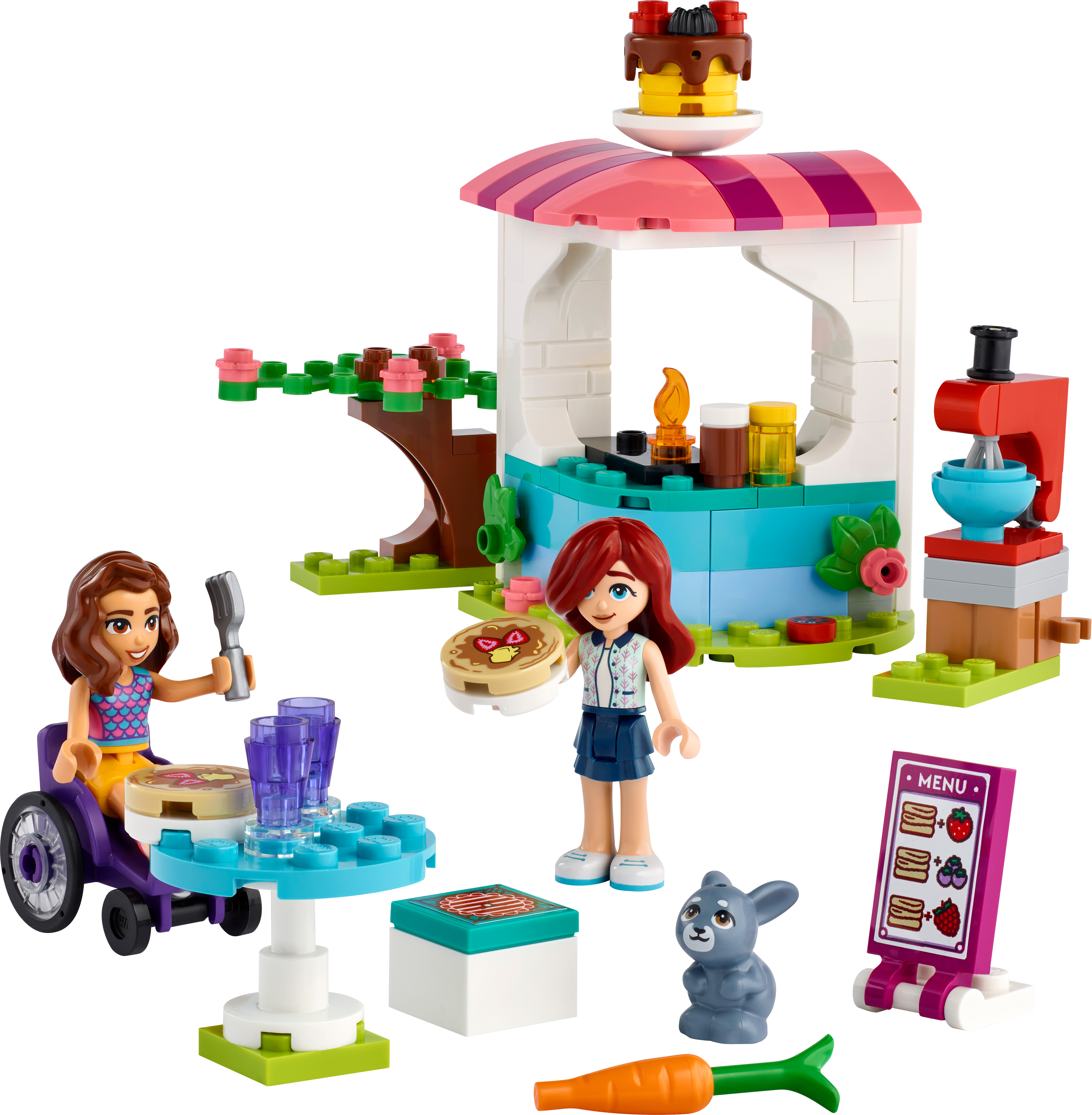 Utensilien fürs Zubereiten von Pfannkuchen: Dieses LEGO® Friends Set beinhaltet eine Speisekarte, 2 Pfannkuchen, Gefäße mit Schokolade und Honig, 2 Gabeln, 2 Tassen, einen Feuerlöscher und eine Rührmaschine