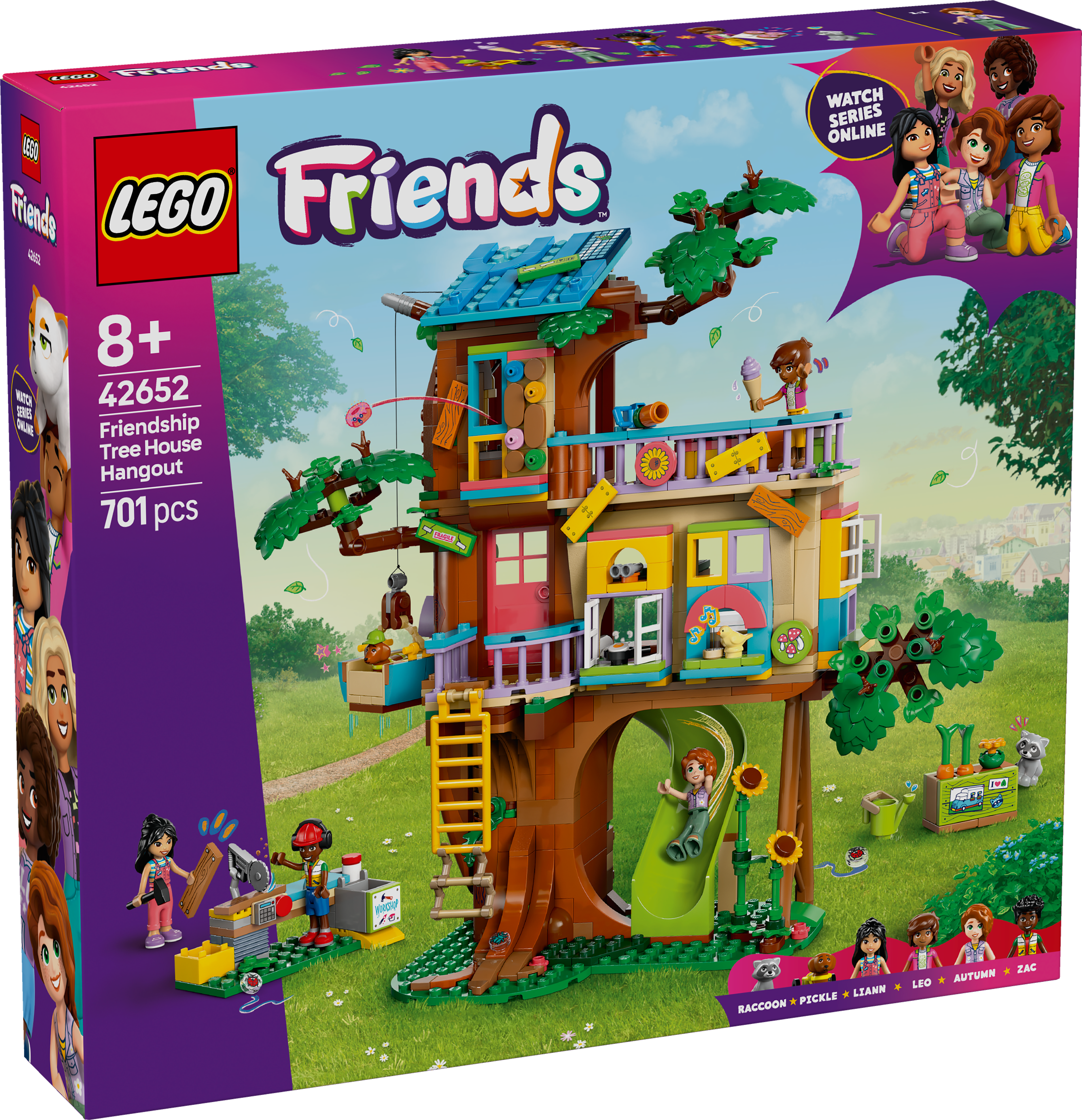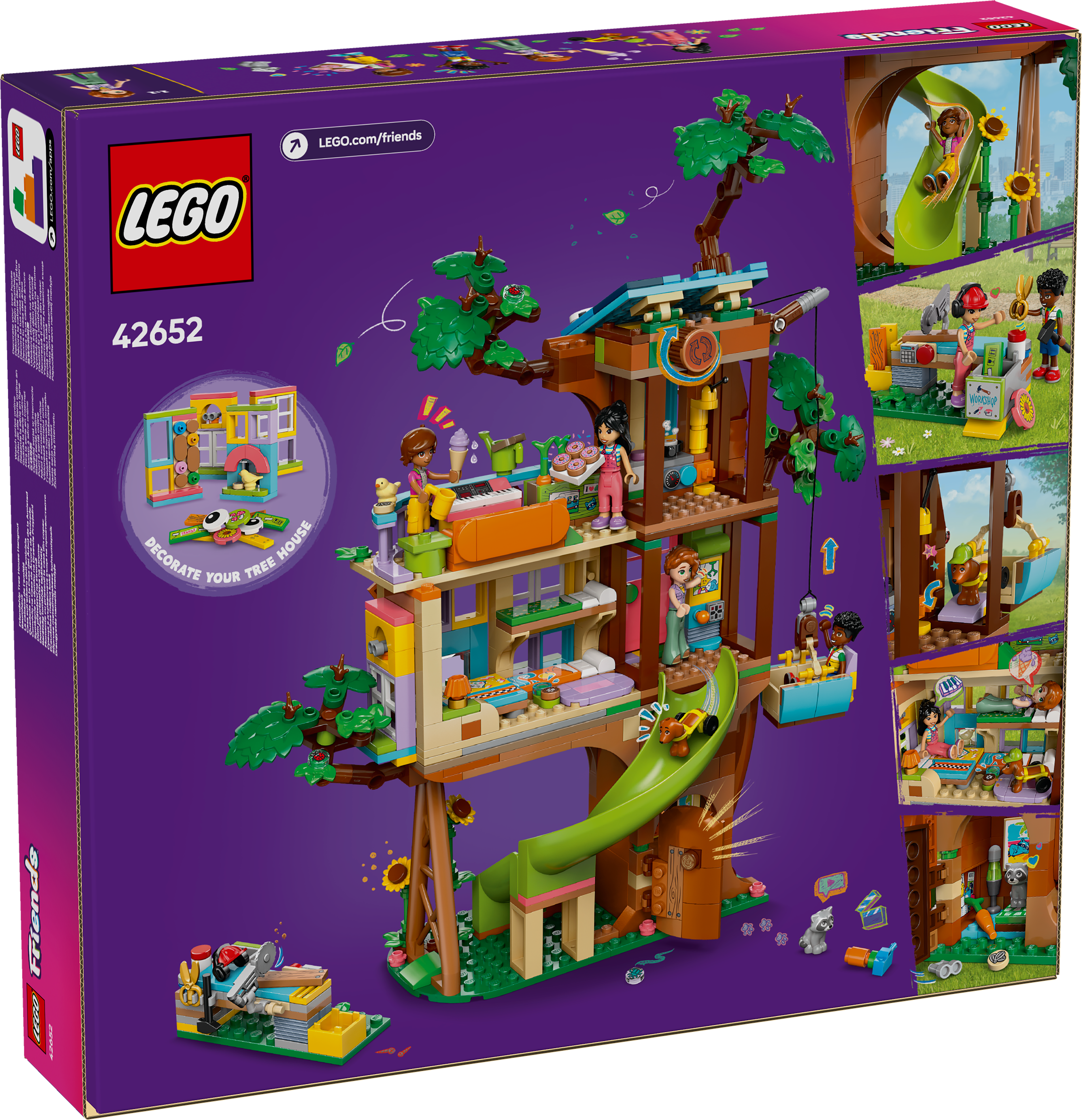 Das LEGO® Friends Baumhaus (42652) lässt Kinder besonders fantasievoll spielen. Mädchen und Jungen ab 8 Jahren können mit diesem detailreichen Bauset eigene Freundschaftsabenteuer darstellen. 4 LEGO Friends Spielfiguren, ein Hund und ein Waschbär sowie eine baubare Werkbank mit Werkzeug laden zum Spielen ein. Kinder können in dem Baumhaus lustige Geschichten mit den Charakteren Liann, Autumn, Leo und Zac darstellen. Es gibt Bereiche zum Spielen, Kochen und Schlafen sowie ein Gemüsebeet mit Möhren. Zu den tollen Details zählen auch der Aufzug für den Hund Pickle und das Geheimversteck des Waschbären. Kinder können kreativ werden und dem Baumhaus mit speziellen Steinchen ihre ganz eigene Note verleihen. Junge Baumeister können auch die Fensterelemente austauschen, um das Modell sogar noch individueller zu gestalten. Schau dir auch die anderen separat erhältlichen Spielzeuge aus dem LEGO Universum an, in denen es viele weitere Geschichten zu entdecken gibt, die Kinder in ihrer sozialen Entwicklung fördern.