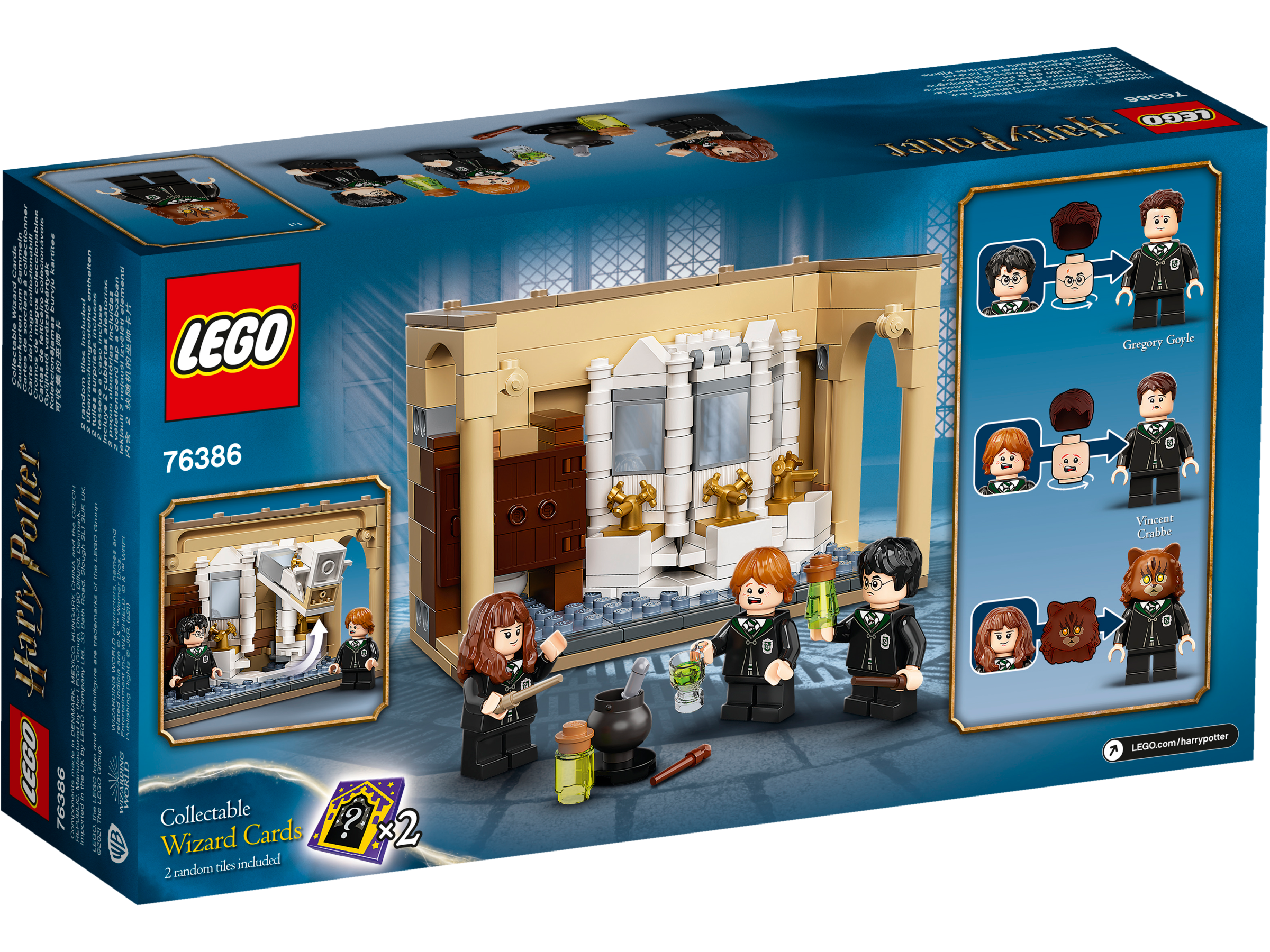 LEGO® Harry Potter™ Hogwarts™: Misslungener Vielsafttrank (76386) für magische Abenteuer in der Hogwarts Toilette. Minifigur-Verwandlungen mithilfe von Vielsafttrank Junge Hexen und Zauberer brauen zusammen mit Harry Potter, Ron Weasley™ und Hermine Granger™ einen mächtigen Vielsafttrank. Wenn die Helden ihn trinken, verwandeln sie sich in Vincent Crabbe und Gregory Goyle. Hierzu müssen Kinder nur die Köpfe der Minifiguren umdrehen, damit ein anderes Gesicht zum Vorschein kommt, und anschließend ein anderes Haarteil aufstecken. Der Zauber kann aber auch misslingen, zum Beispiel wenn sich Hermine in eine Katze verwandelt! Weitere Überraschungen: Harry Potter als exklusive goldene Jubiläums-Minifigur, 2 magische Überraschungskartenelemente und ein geheimer Tunnel unter dem Waschbecken. Wenn dieses Set mit LEGO Harry Potter: Hogwarts Kammer des Schreckens (76389) kombiniert wird, verbindet der geheime Tunnel diese beiden Räume. Mithilfe dieses magischen Modulsystems können Kinder immer mehr Räume hinzufügen und ein vollständiges Modell von Schloss Hogwarts erschaffen.
