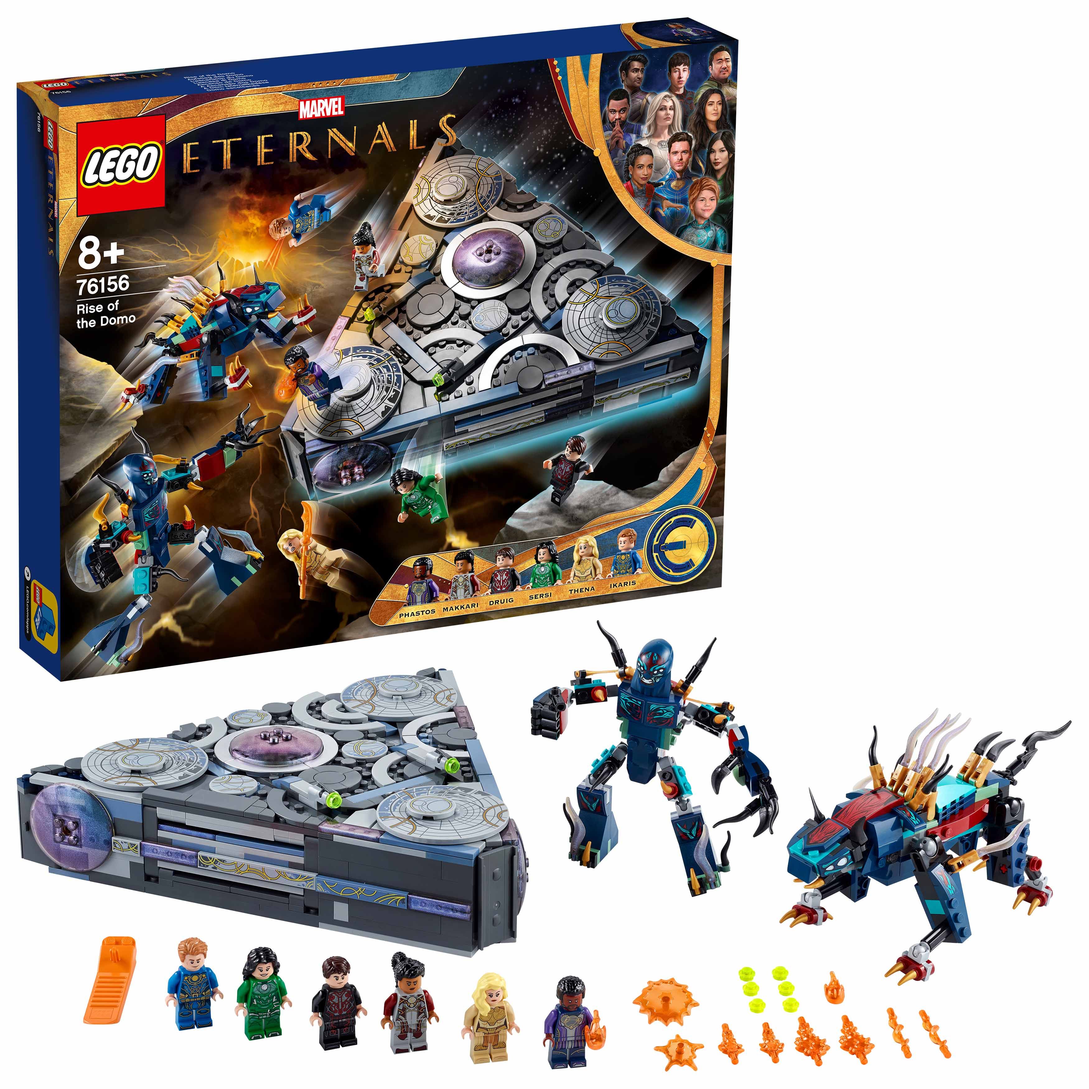 Beinhaltet 6 Minifiguren – Makkari, Ikaris, Thena und Sersi sowie die beiden exklusiven Charaktere Druig und Phastos. 2 Deviant-Actionfiguren sowie Kro, der Deviant-Anführer, ein Raumschiff, Ausrüstung und Zubehör sind ebenfalls enthalten.