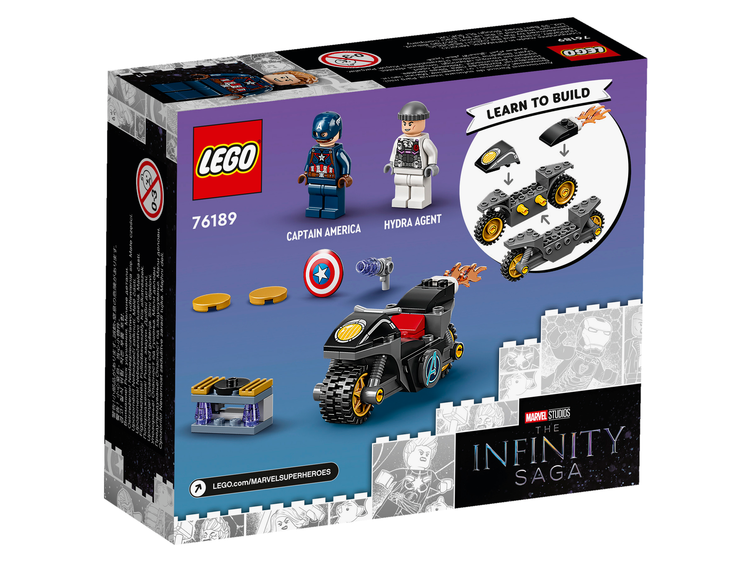 • Beinhaltet 2 Minifiguren – Captain America und einen Hydra-Agenten –, sowie ein baubares Motorrad und einen Scheiben-Shooter mit abnehmbarem Blaster.
