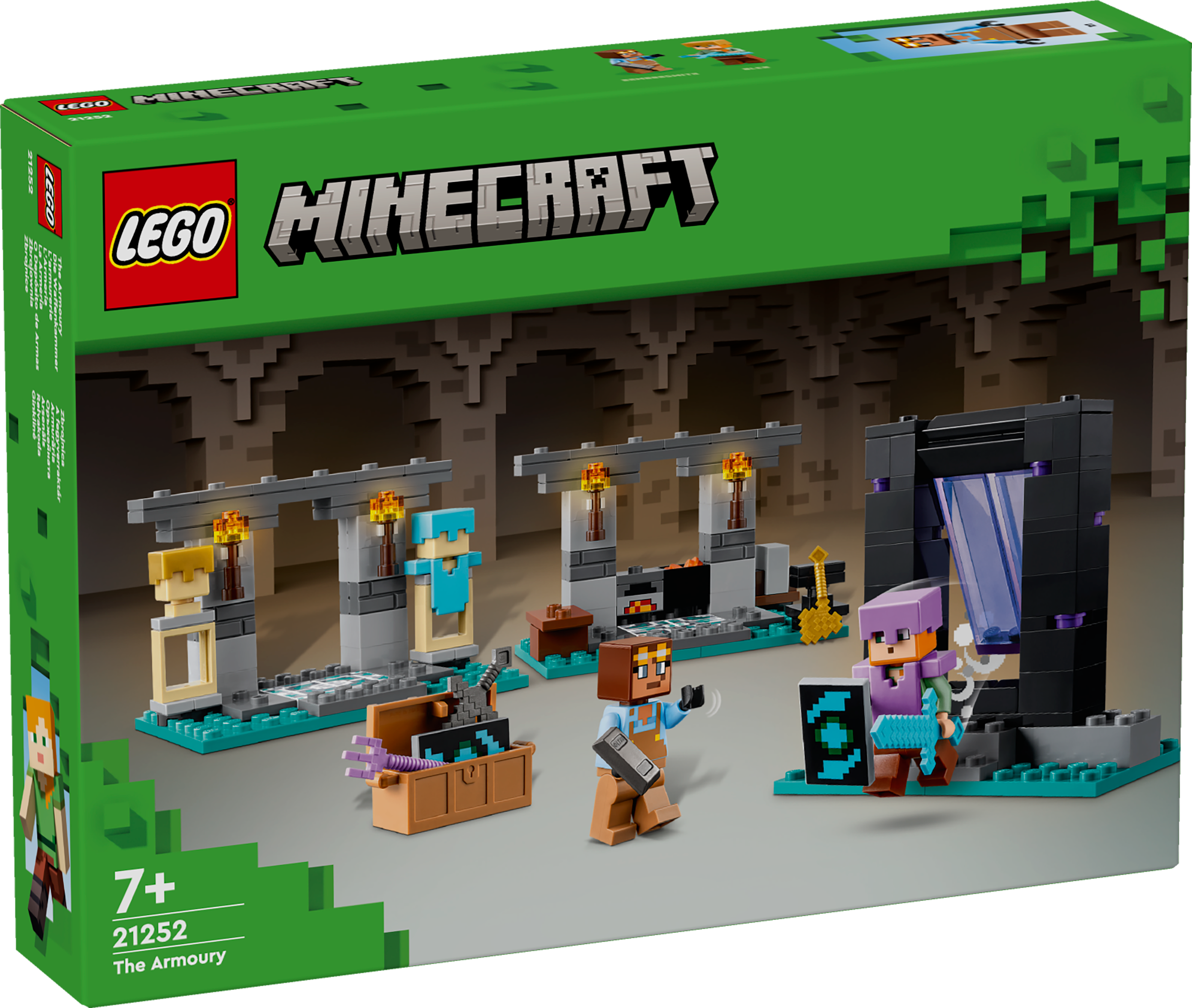 Minecraft® Spieler ab 7 Jahren werden begeistert und kreativ mit den Minecraft-Waffen und Funktionen des Sets Die Waffenkammer (21252) spielen. Dieses LEGO® Minecraft Bauset ist eine tolle Geschenkidee für Kinder und dient Gamern als Portal zu kreativen Minecraft-Abenteuern. Dieses Bauspielzeug zum Videospiel für Kinder beinhaltet 2 vertraute Figuren: die Minecraft-Actionheldin Alex mit Schild und Diamantschwert sowie den fleißigen Waffenschmied. Dein Kind kann 3 Bereiche erkunden: Im Arbeitsbereich befinden sich ein Amboss, ein Ofen, ein Schleifstein und ein Kessel voll Lava. Im Raum mit den ausgestellten Rüstungen steht auch eine Truhe, die eine goldene Axt, einen verzauberten Dreizack, ein Netherit-Schwert, einen Schild sowie weitere Minecraft-Ressourcen enthält. Und durch die Schwingtür des Netherportals gelangen die Spieler zu ihrem nächsten Abenteuer. Dieses Minecraft-Abenteuerspielzeug ist ein Erweiterungsset für Rollenspiele und lässt sich leicht mit anderen separat erhältlichen LEGO Minecraft Sets kombinieren, vor allem mit Hinterhalt am Netherportal (21255).