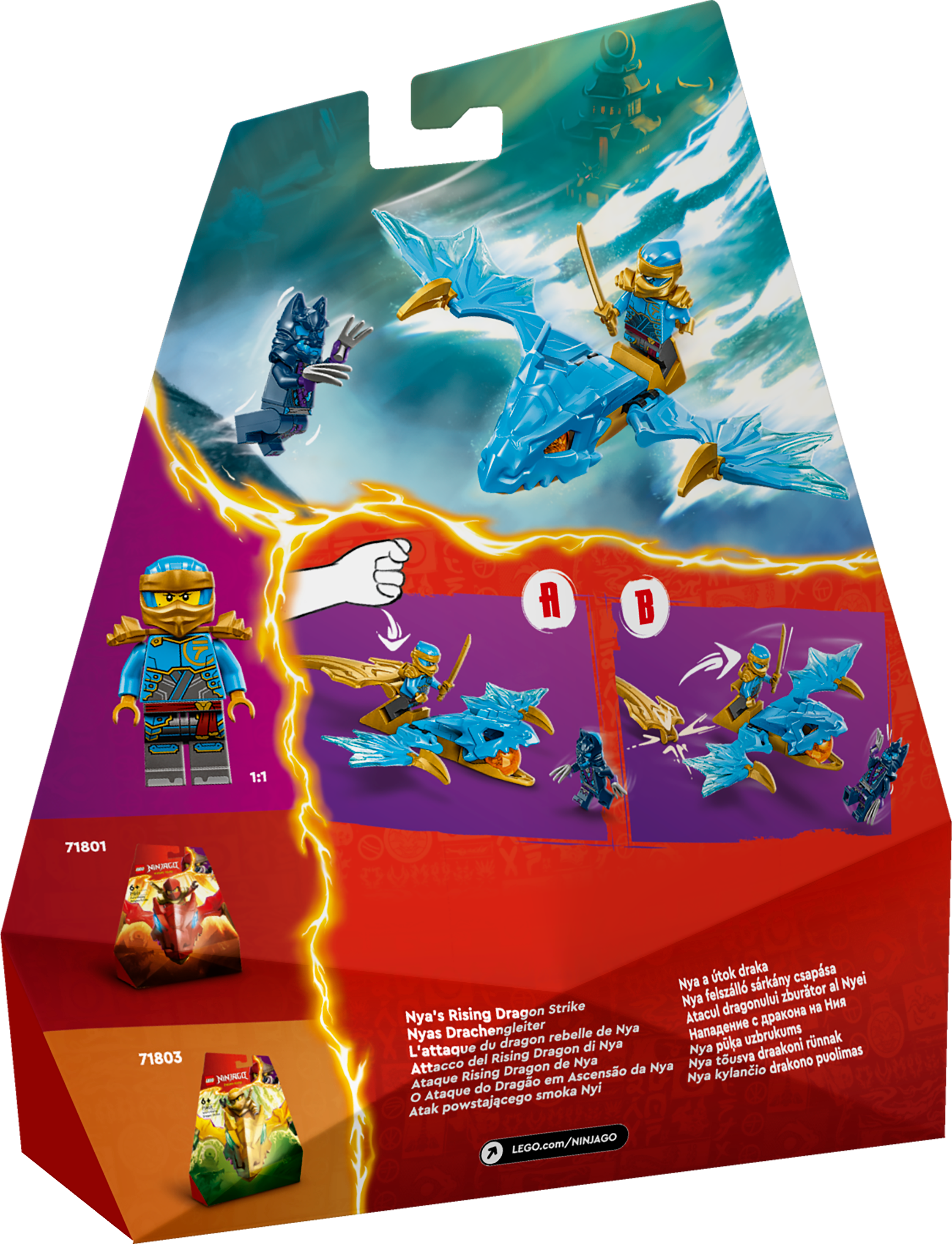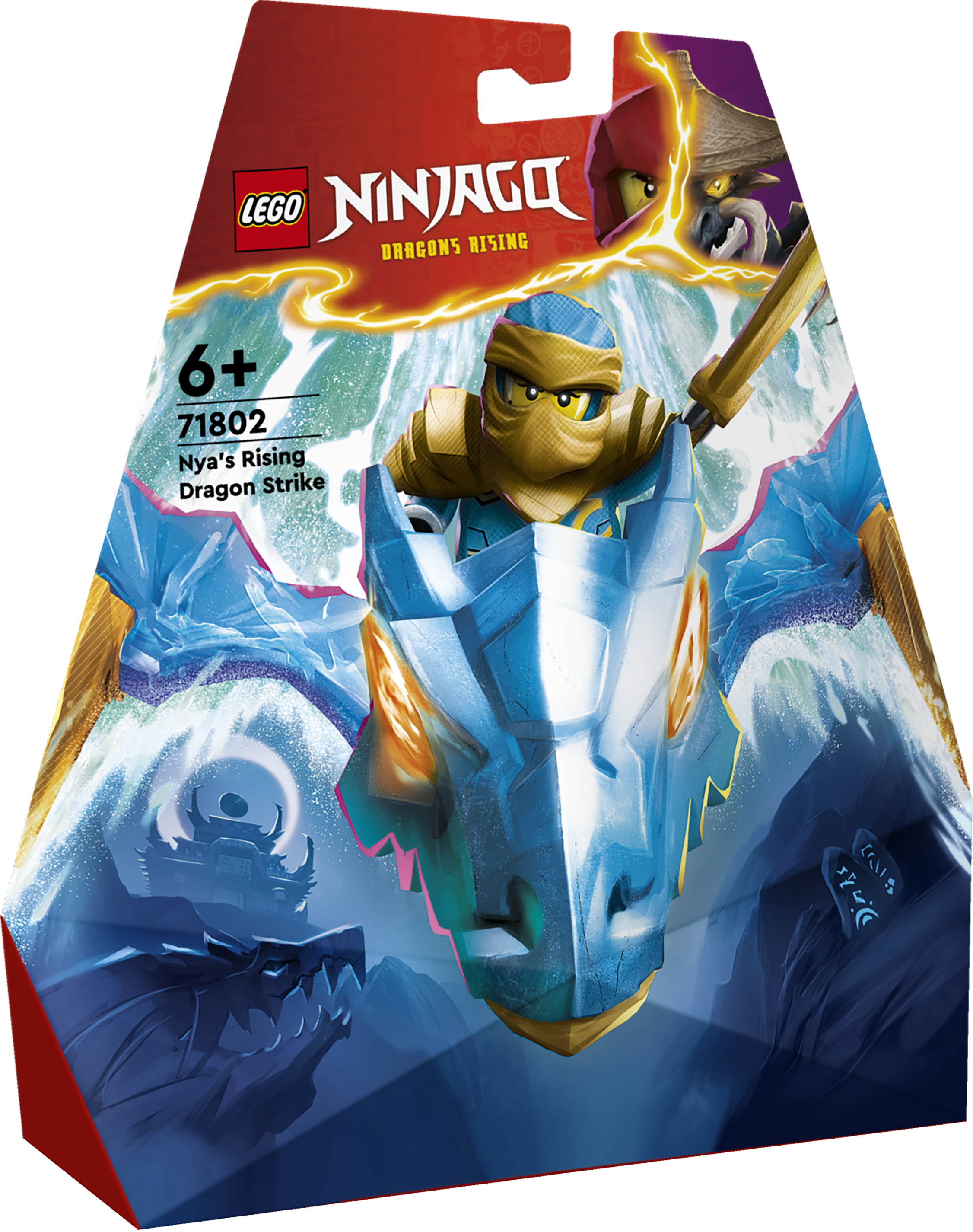 Jungen und Mädchen ab 6 Jahren können die Abenteuer aus der 2. Staffel der TV-Serie NINJAGO® Aufstieg der Drachen mit diesem Ninja-Spielset nachstellen. Nyas Drachengleiter (71802) lässt Kinder das allererste LEGO® NINJAGO Drachen-Actionspielzeug bauen. Schlägt man den goldenen Schwanz des Drachen dann nach unten, geht der Actionspaß so richtig los. Das Bauset beinhaltet 2 Minifiguren: Die Drachenreiterin Nya schwingt ein Katana und reitet auf dem blauen Drachen. Der Wolfsklauenjäger verfügt dagegen über scharfe Klauen. Kinder können die Ninja-Figuren packende Duelle austragen lassen. Der Sieger holt sich ein oranges Drachenpower-Element aus dem aufklappbaren Maul des blauen Drachen. In den anderen separat erhältlichen LEGO NINJAGO Bau- und Spielsets für Kinder finden junge Ninja-Fans Mechs, Fahrzeuge und Tempel für spannende Rollenspiele und Abenteuer. Jedes dieser Fantasy-Spielzeuge kann auch mithilfe der LEGO Builder App gebaut werden, die dich und dein Kind auf ein ebenso einfaches wie intuitives Bauabenteuer mitnimmt.