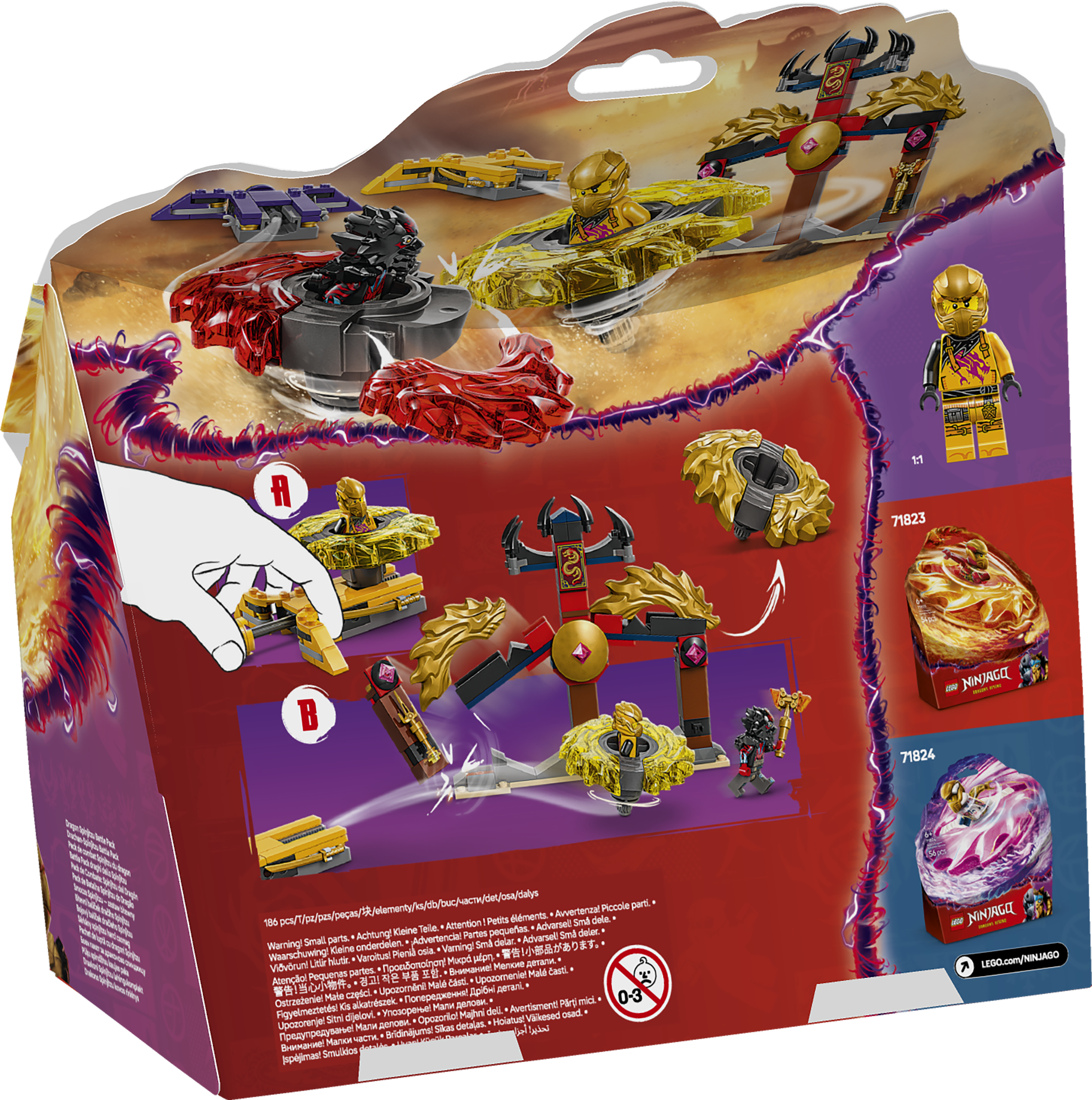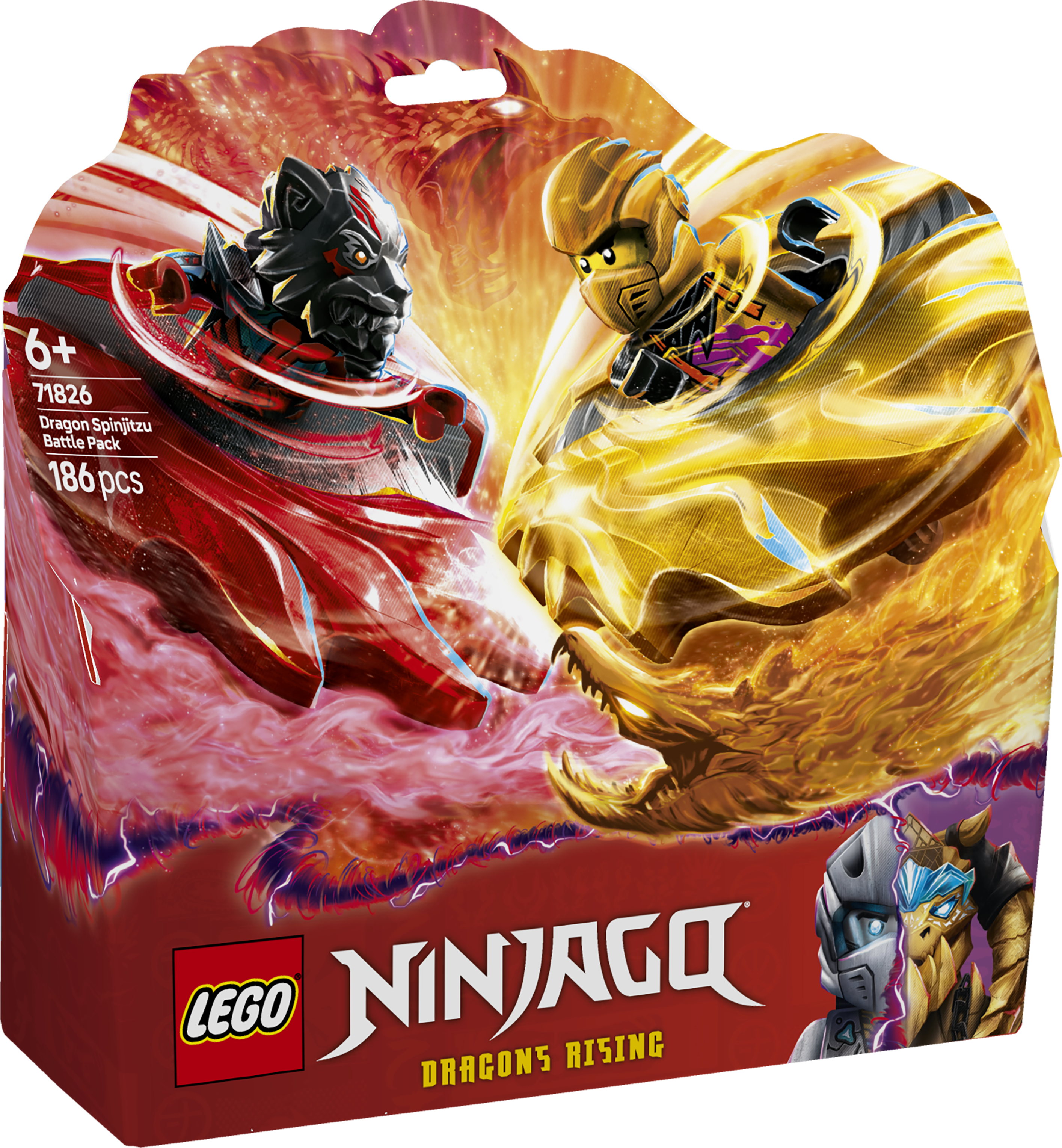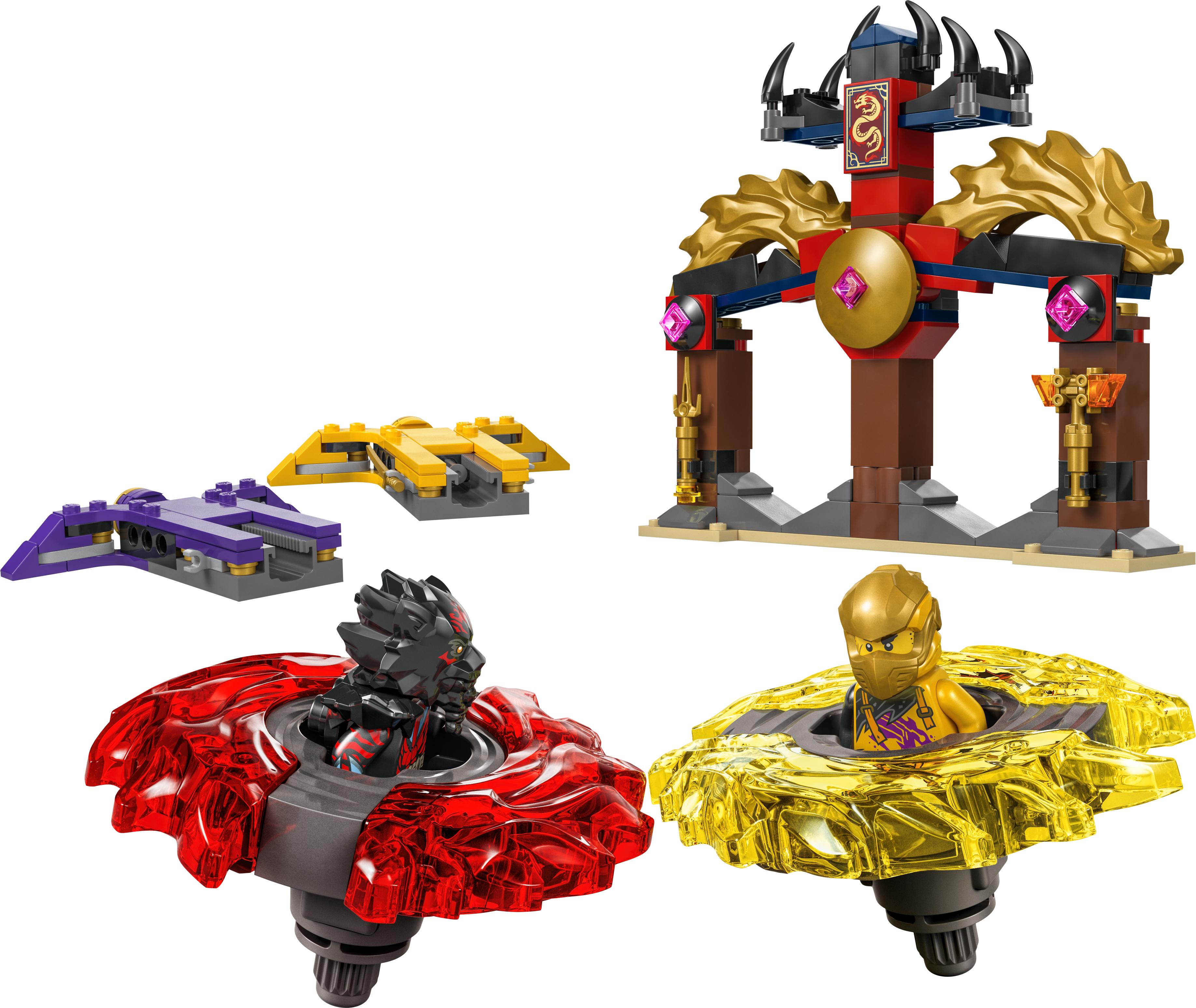 Das Drachen-Spinjitzu Battle Pack (71826) ist ein Action-Spielzeug, das Jungen und Mädchen ab 6 Jahren die atemberaubenden Actionszenen aus der 3. Staffel der TV-Serie NINJAGO® Aufstieg der Drachen nachstellen lässt. Dieses kleine LEGO® Action-Spielset beinhaltet eine Tempelarena, die beiden Minifiguren Arin und Ras sowie 2 Drachen-Spinjitzu-Spinner. Kinder können die Spinner in die Startkatapulte stecken und dann loswirbeln lassen, damit sie sich packende Duelle liefern. Kinder können sich auf spannende Abenteuer, Rollenspiele und Duelle zwischen Gut und Böse freuen. Sie müssen nur Arins gelben Spinner und Ras‘ roten Spinner loswirbeln lassen. An beiden Spielzeugen befinden sich Energie-Elemente, die bei einem Aufprall abplatzen können. Und die NINJAGO Figuren können ihre Spinner mit goldenen Elementen upgraden, wenn sie gegen die Arena prallen und diese zum Einsturz bringen. In dem breiten Angebot an LEGO NINJAGO Bausets und baubaren Action-Spielzeugen finden Ninja-Fans Mechs, Drachen und Tempel für jede Menge Actionspaß. Jedes dieser Ninja-Spielsets kann auch mithilfe der LEGO Builder App gebaut werden, die dich und dein Kind auf ein ebenso einfaches wie intuitives Bauabenteuer mitnimmt.