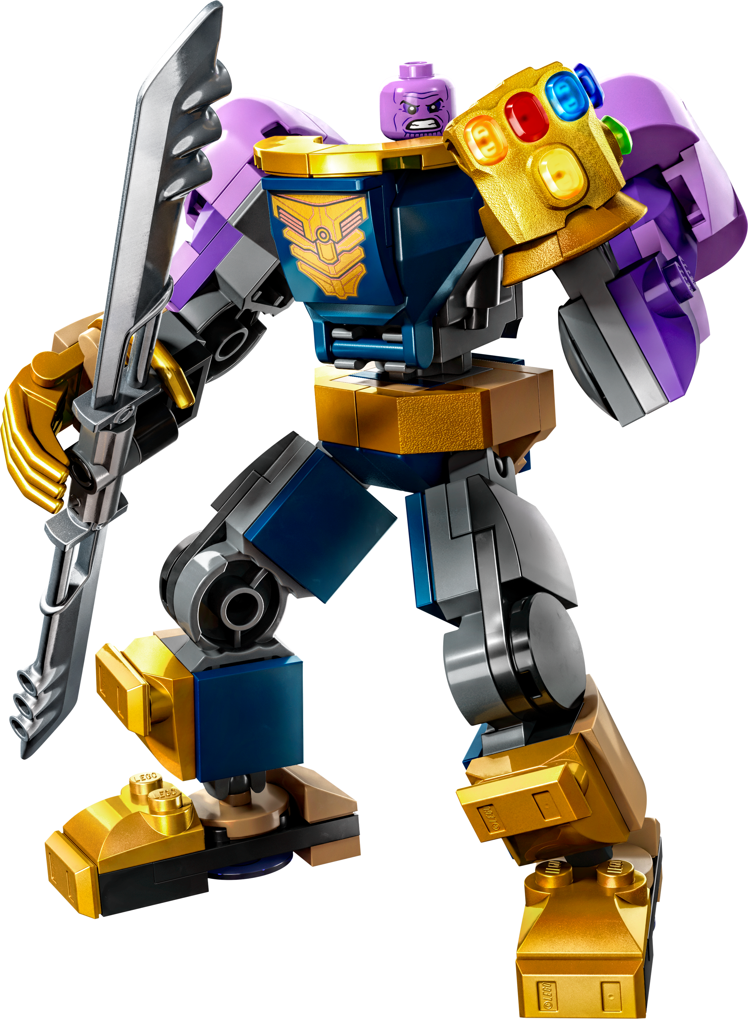 Lässt sich mühelos in coole Actionposen bringen: Die Thanos Minifigur passt ins aufklappbareCockpit des Mechs, dessen bewegliche Glieder unzählige Spiel- und Ausstellungsmöglichkeiten bieten