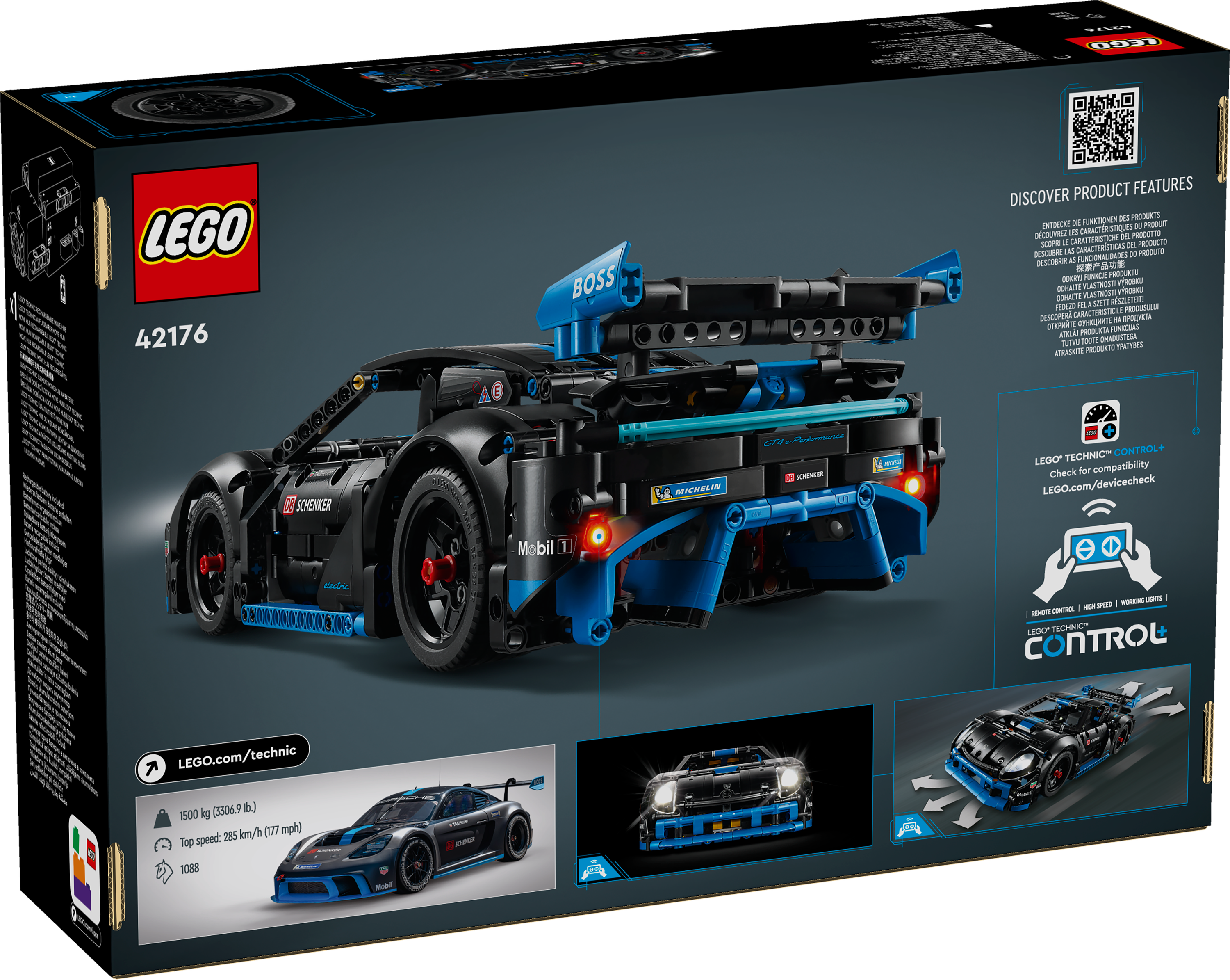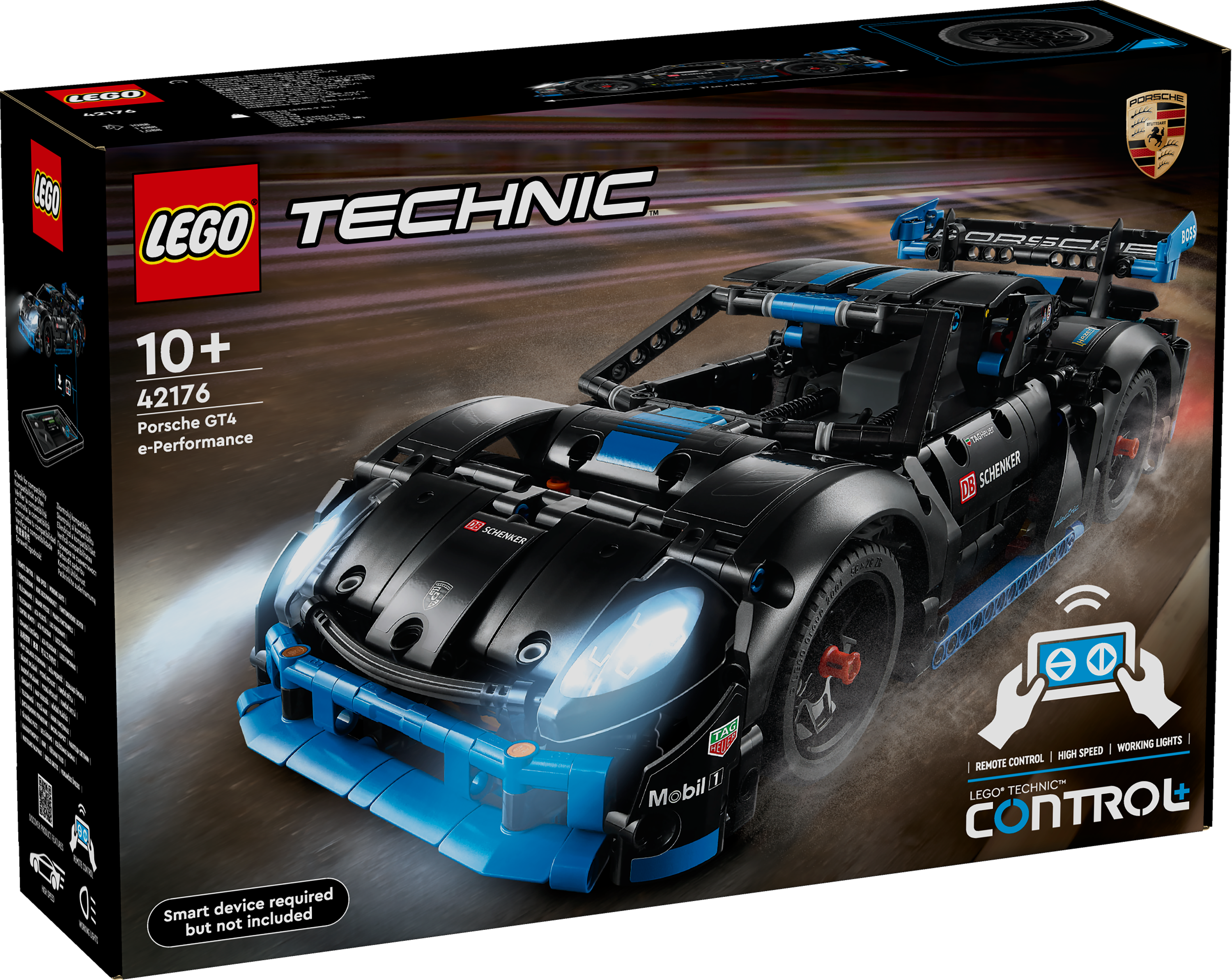 Der LEGO® Technic Porsche GT4 e-Performance Rennwagen (42176) bietet Kindern ab 10 Jahren ein spannendes Bauprojekt. Das ferngesteuerte Spielzeugmodell des Rennwagens hat viele interaktive Funktionen und ist unser bis heute (Stand: August 2024) schnellster LEGO® Technic CONTROL+ Flitzer. Öffne die CONTROL+ App, um die Lenkung zu bedienen, die Lichter zu steuern und dir in Echtzeit Daten aufs Display zu holen. Nach dem faszinierenden Bauerlebnis können Kinder ihren Spielzeug-Porsche mit coolen Fernsteuerungsfunktionen auf die Probe stellen und den Flitzer vorwärts und rückwärts fahren lassen. Dank der aufklappbaren Türen gibt es an diesem detailreichen Auto viel zu entdecken. Sogar die Lichter funktionieren. Dieses ferngesteuerte Auto hat viele coole Funktionen, die jungen LEGO Baumeistern die Welt der Technik näherbringen. Das Set ist ein tolles Geschenk für Kinder, die Spielzeug-Rennwagen lieben. Zu dem Auto ist auch die LEGO Builder App verfügbar, die Baumeister 3D-Modellansichten vergrößern und drehen und ihren Baufortschritt verfolgen lässt.